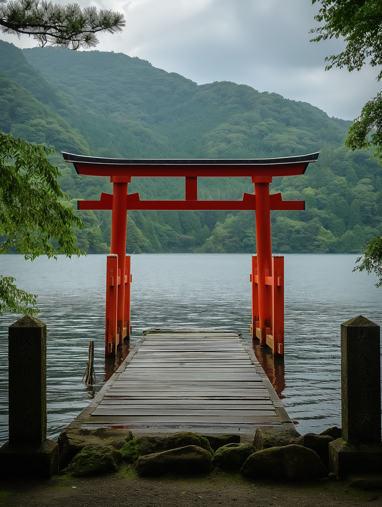 Serene Japanese torii gate by a lake, surrounded by lush green mountains and trees, under an overcast sky.