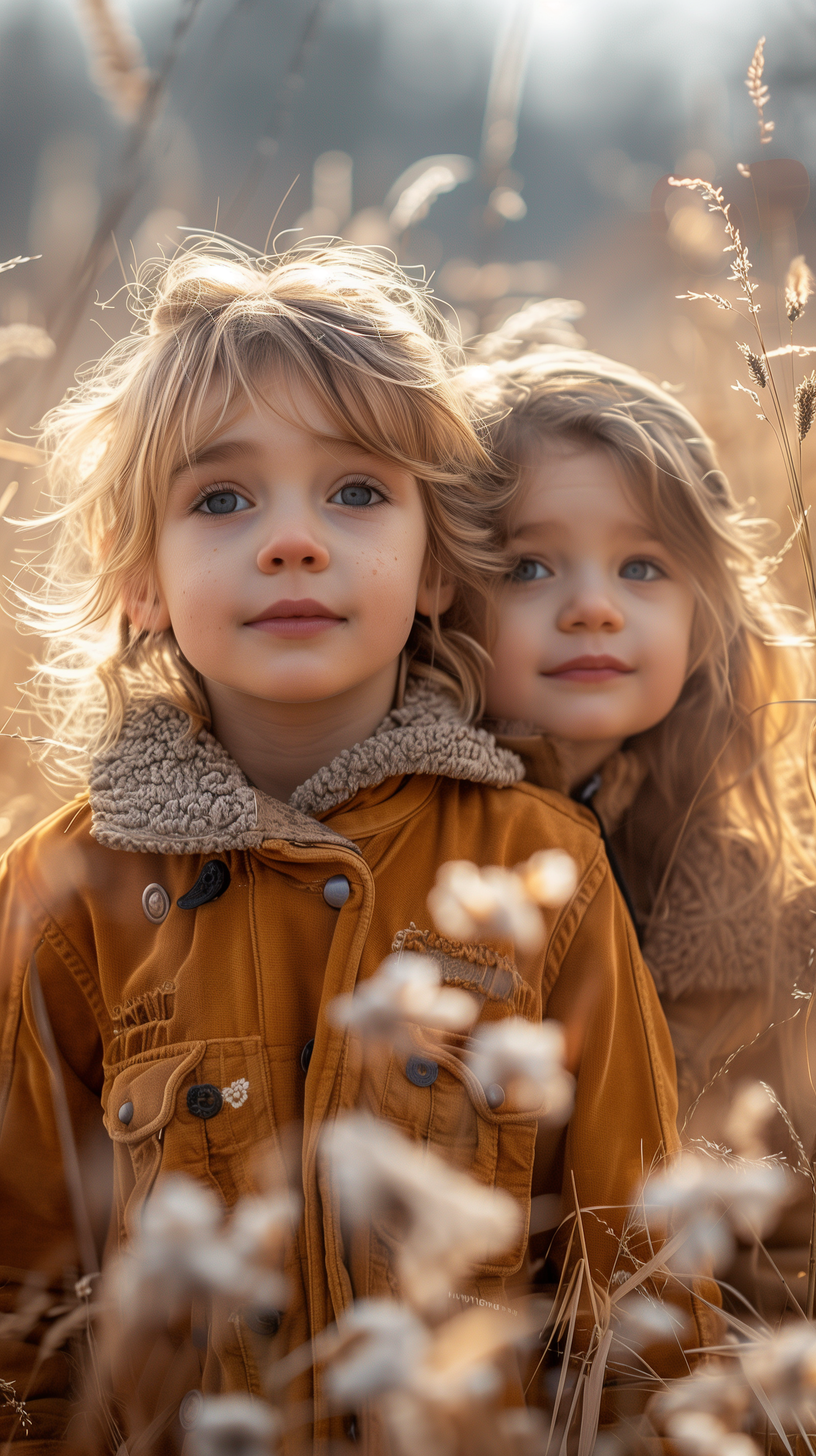 Two blonde children in a sunlit field, wearing brown jackets, surrounded by tall grasses and warm golden light.