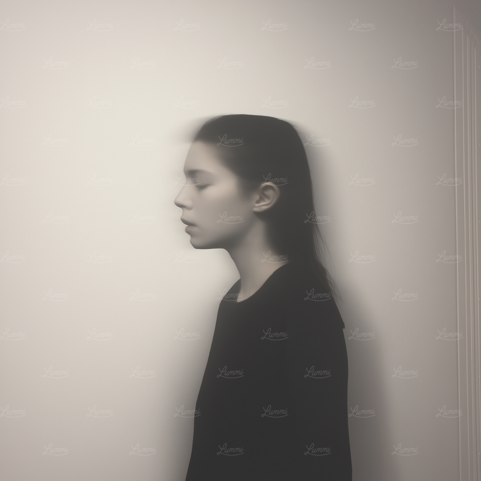 A serene profile of a young woman with closed eyes against a soft, blurred background, creating a dreamlike and contemplative mood.