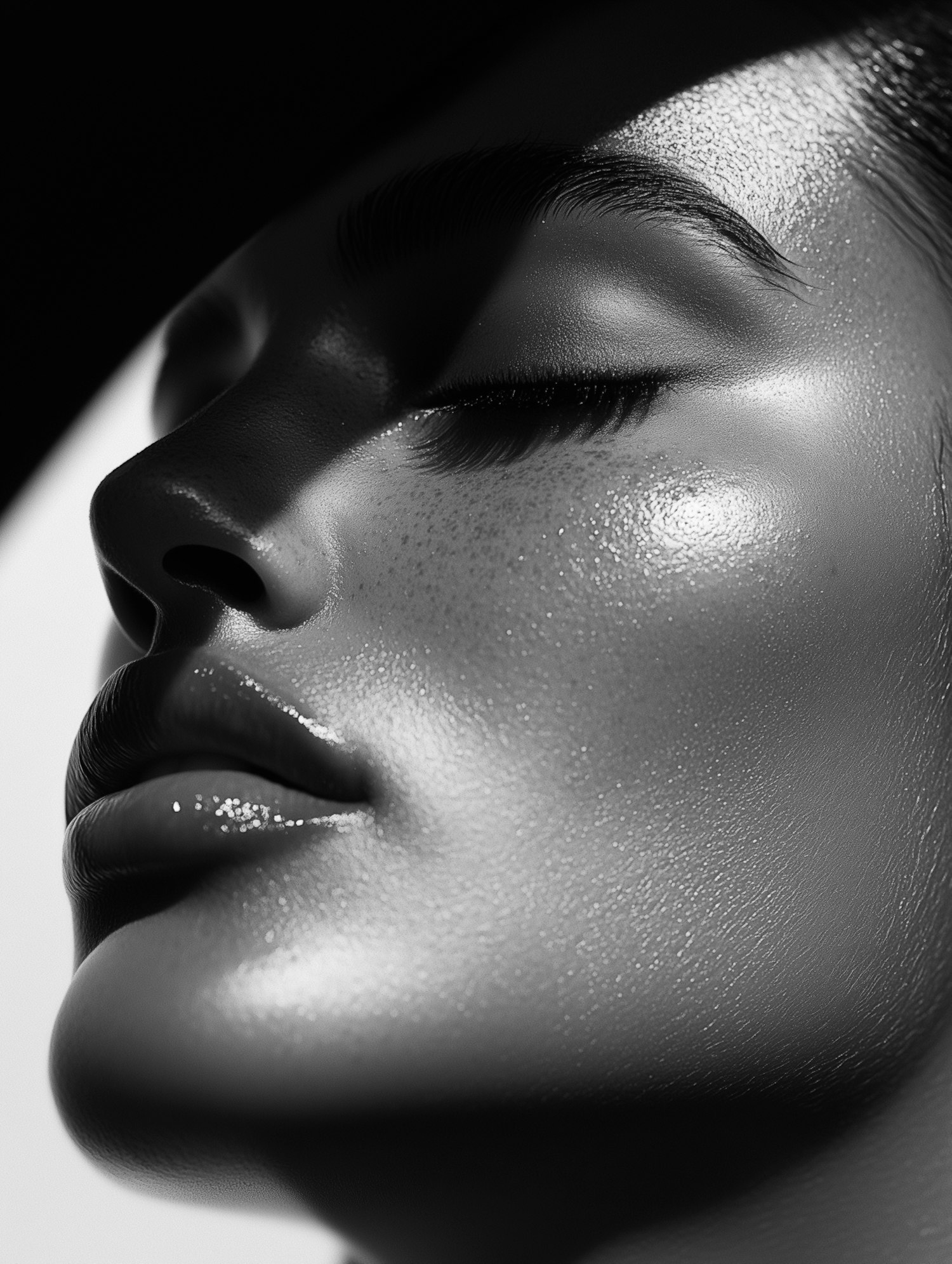Dramatic black and white close-up of a woman's serene profile with striking light and shadow play.