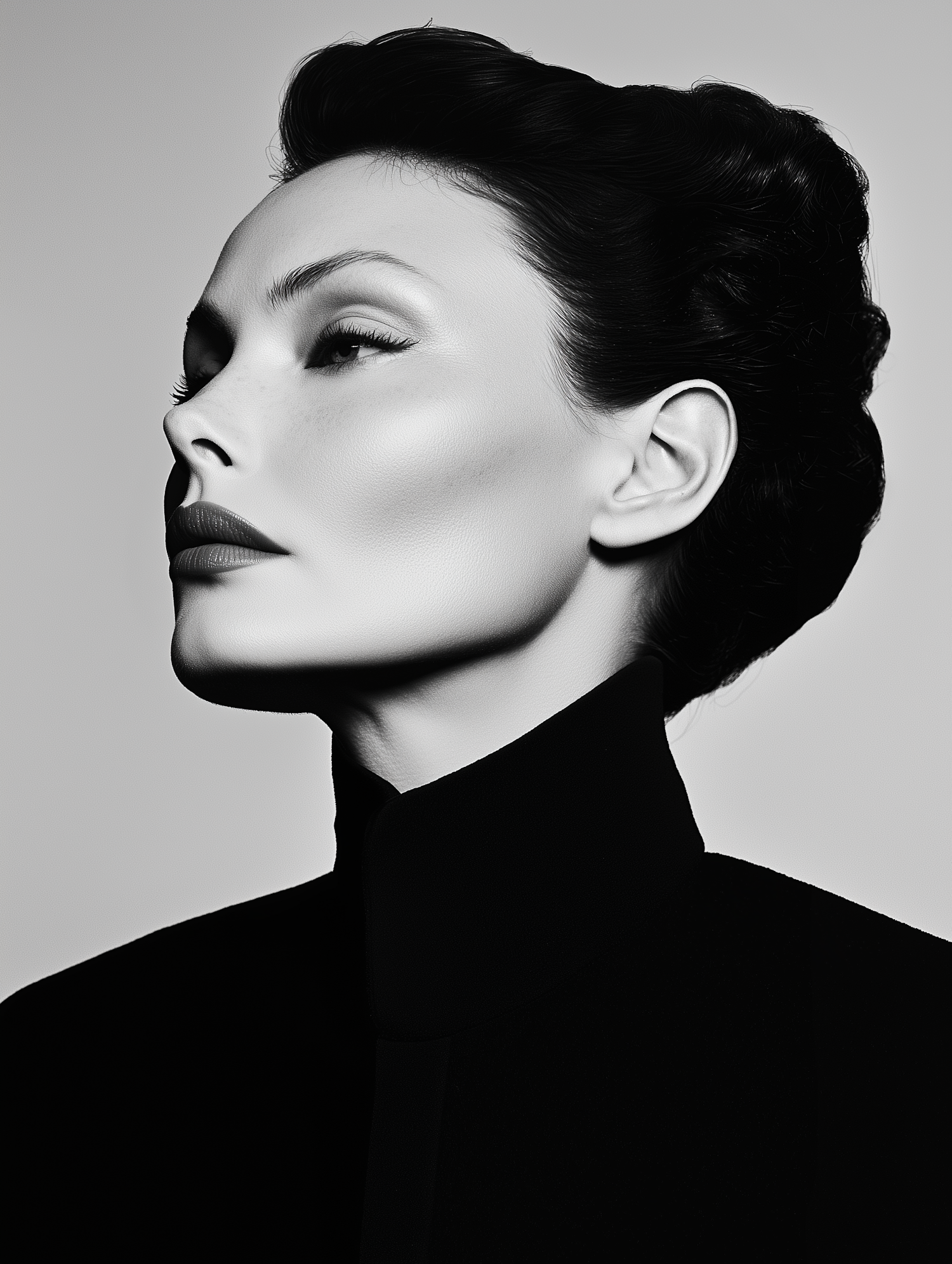 Elegant black and white portrait of a woman with a high-collared outfit and dramatic lighting, highlighting her striking profile.