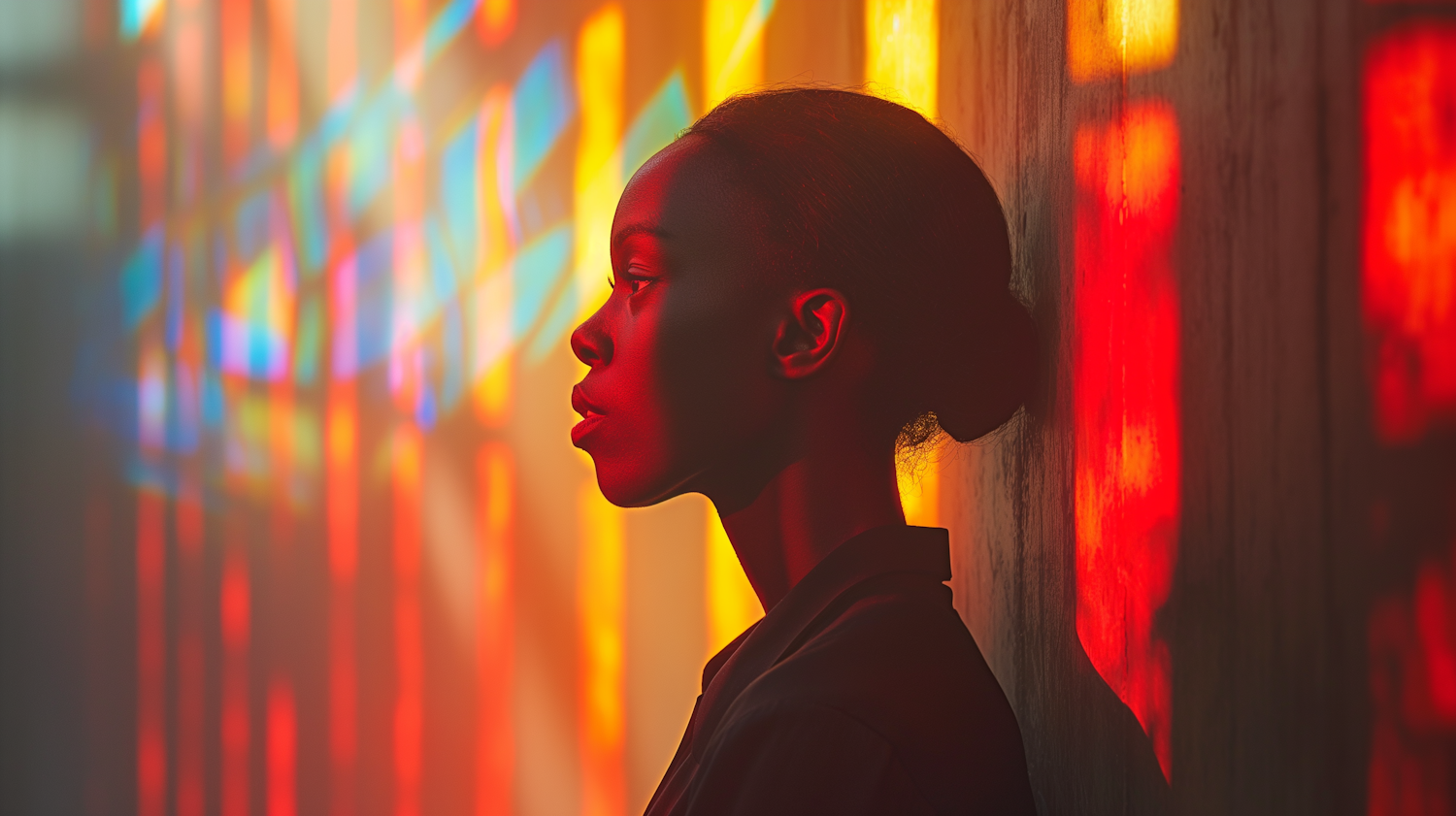 A woman in profile against a wall with vibrant, multicolored light patterns casting a warm glow on her face.