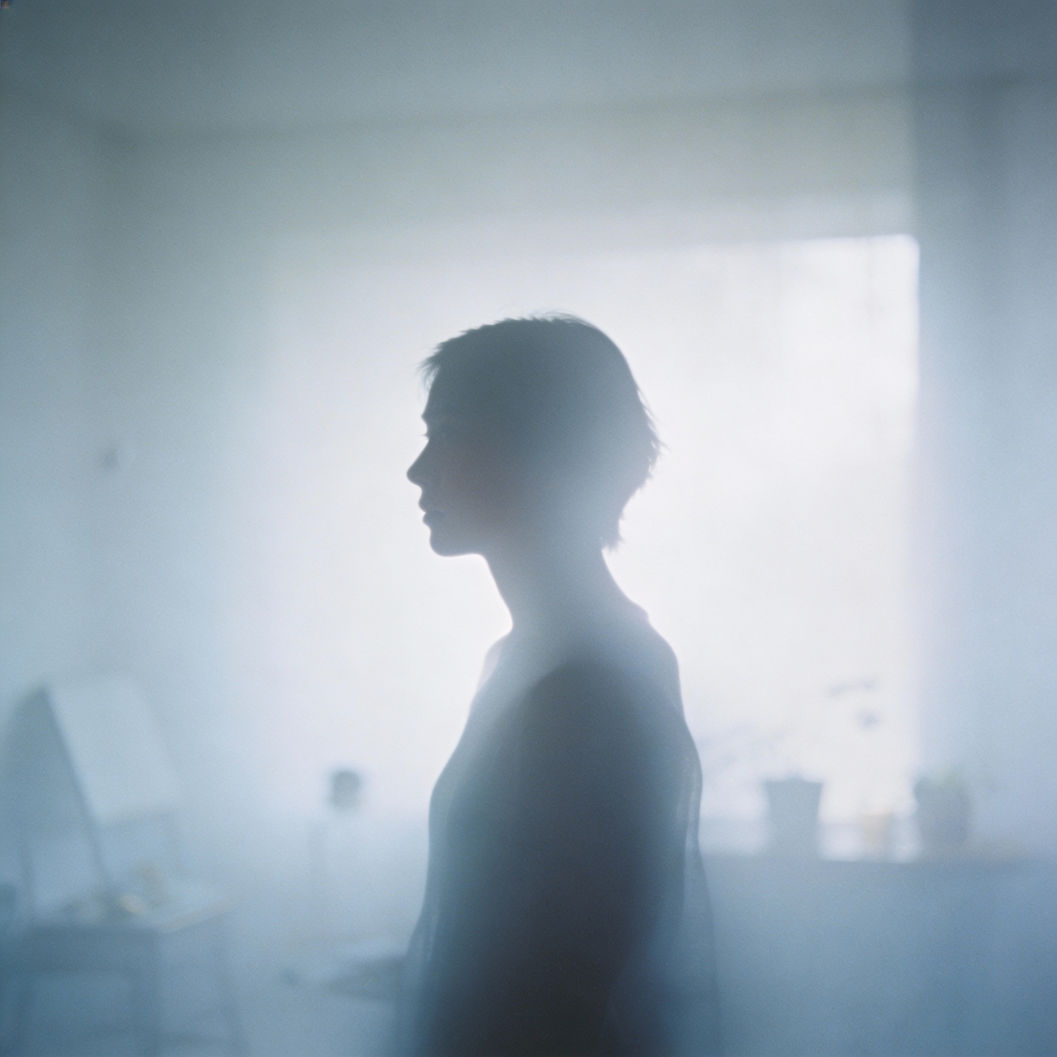 A serene silhouette of a person with short hair against a softly lit, dreamy background with subtle furniture and plant details.