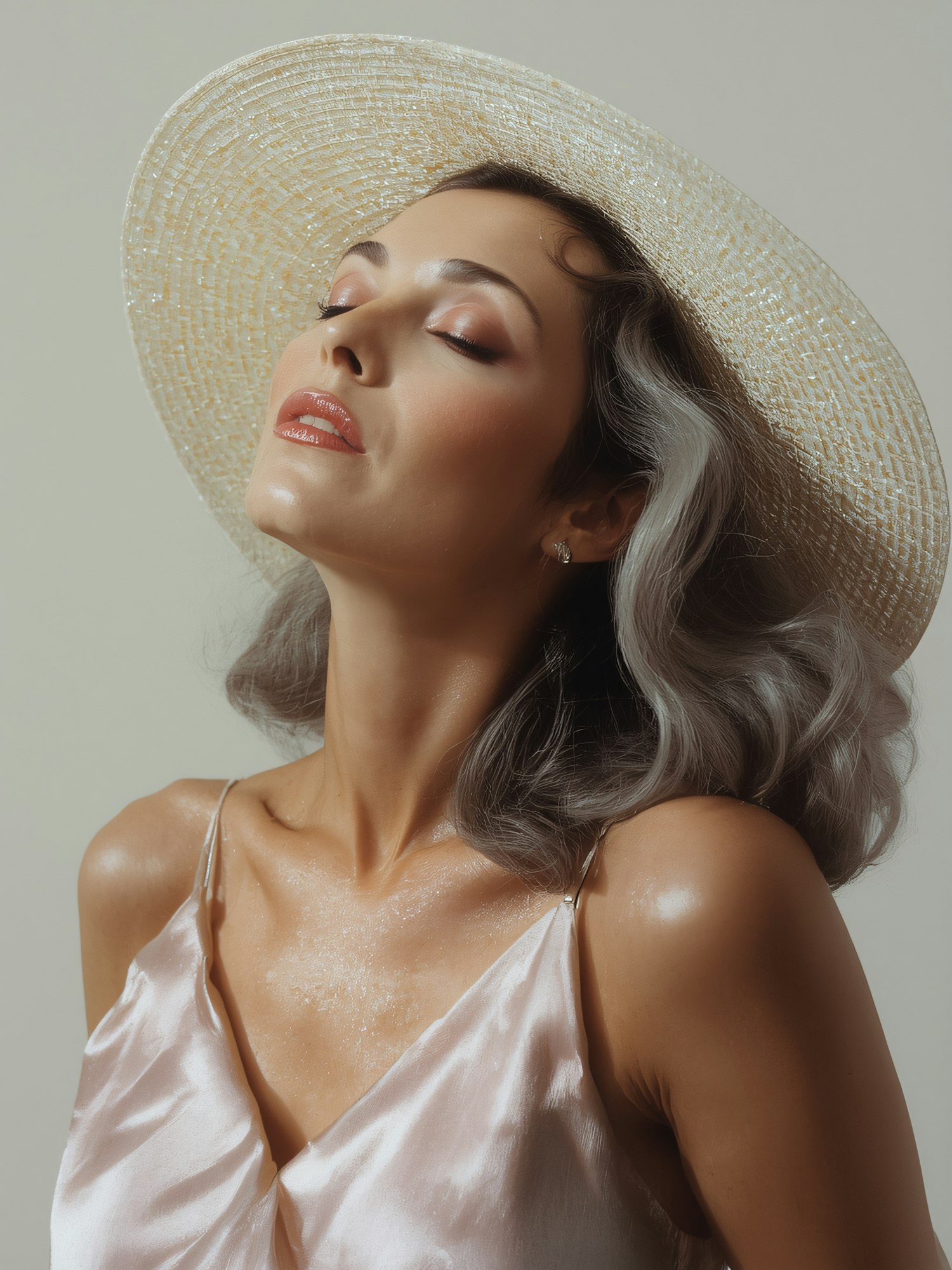 A serene portrait of a woman in a straw hat and silky top, with soft lighting highlighting her elegant features and silver hair.