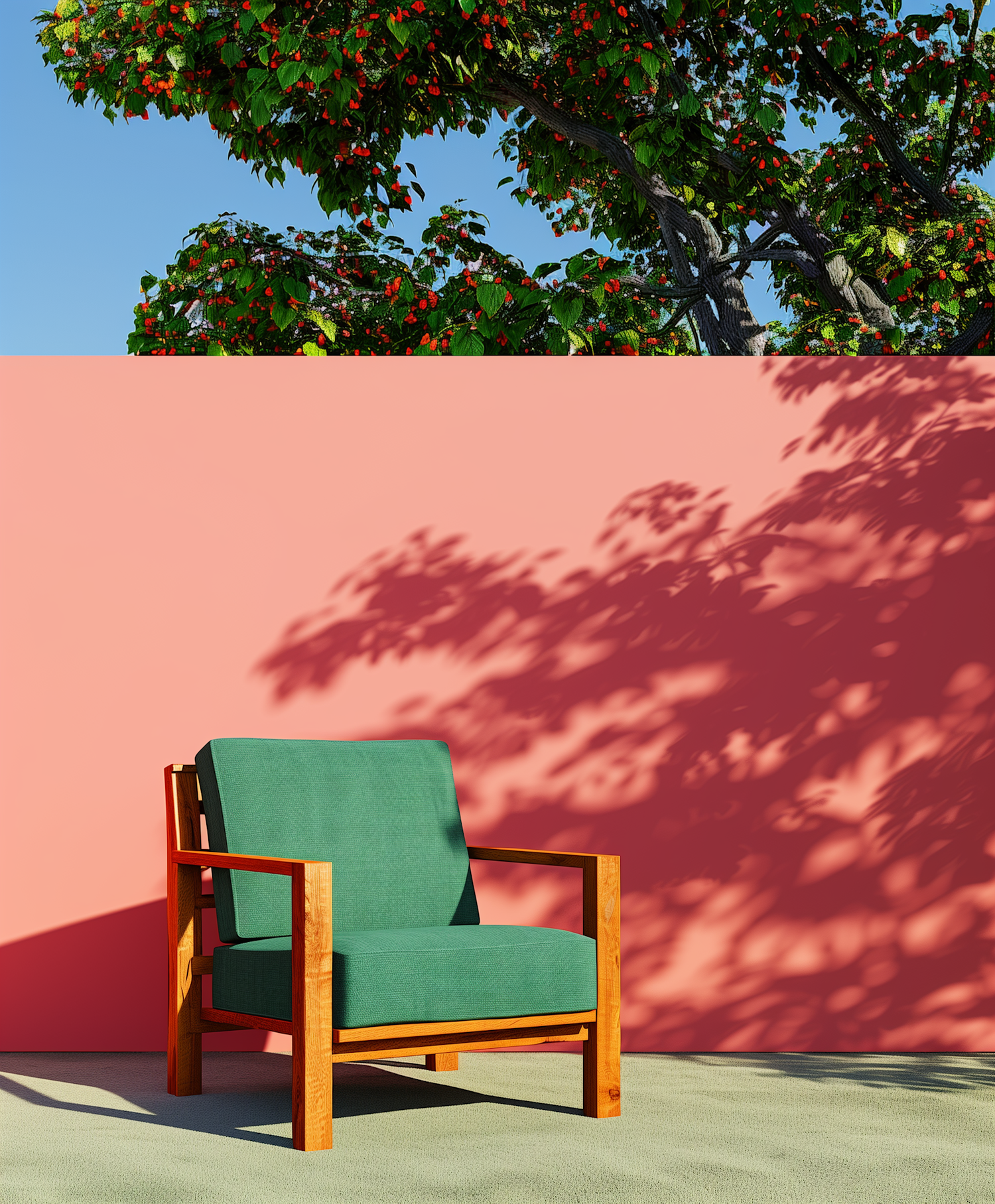 Wooden chair with green cushion against a coral wall, tree with red berries above, creating a vibrant outdoor scene.
