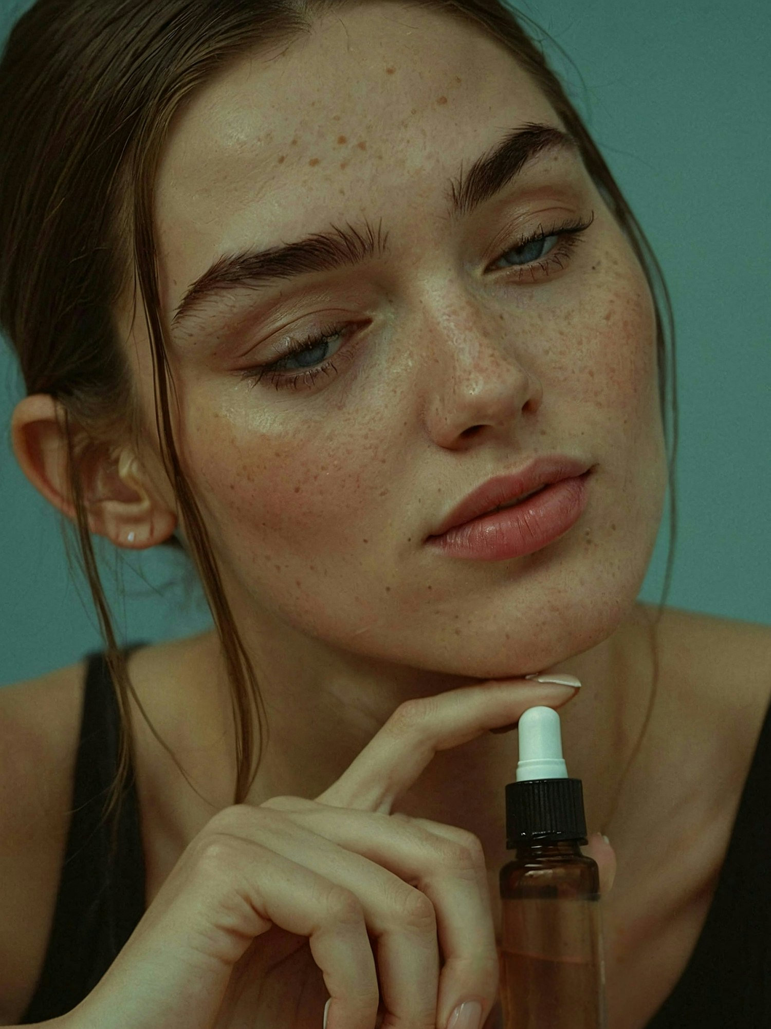 Close-up of a freckled woman holding a skincare dropper bottle, with a serene expression against a teal background.