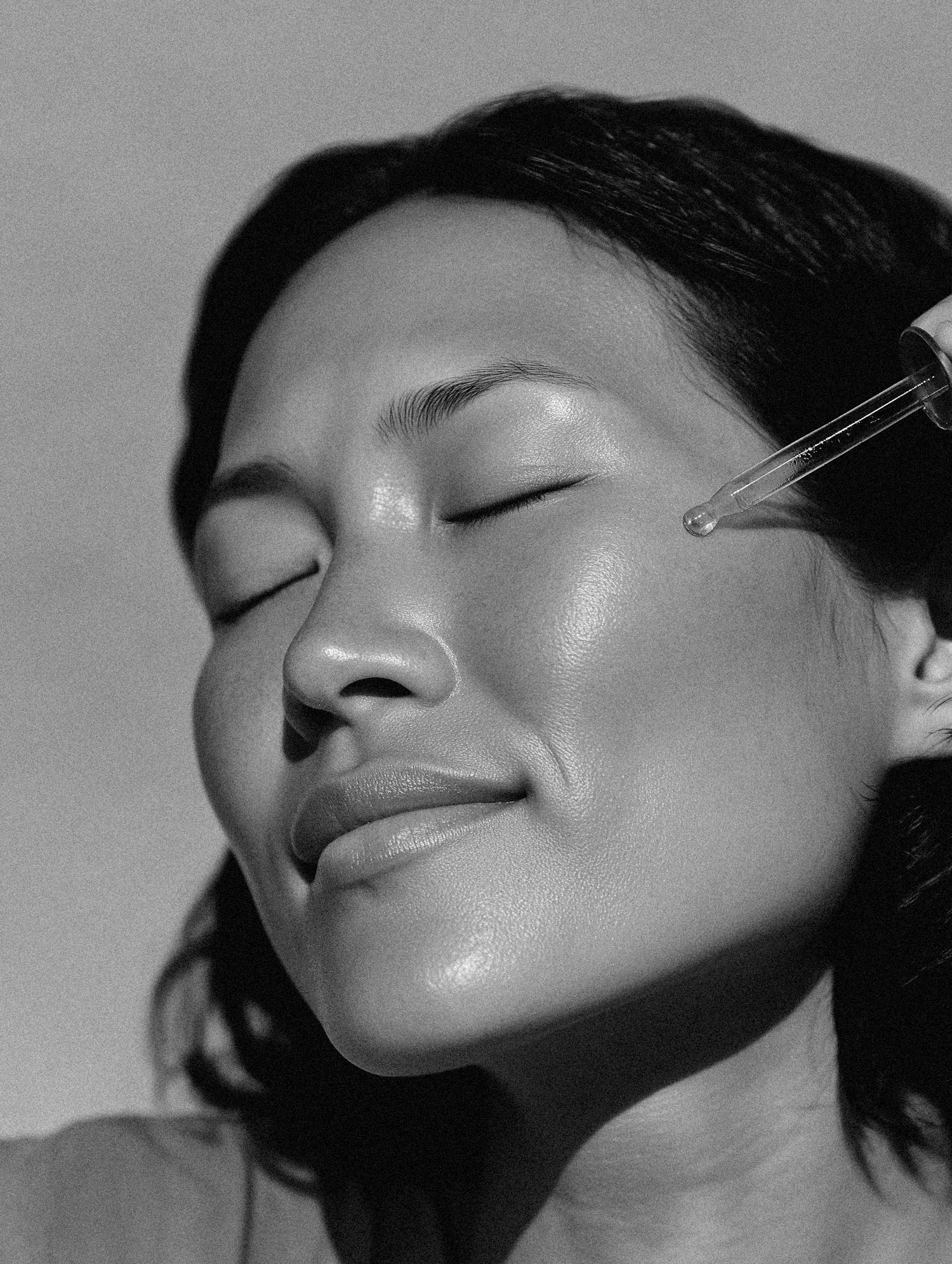 Black-and-white close-up of a person applying skincare serum with a dropper, highlighting smooth, glowing skin and a serene expression.