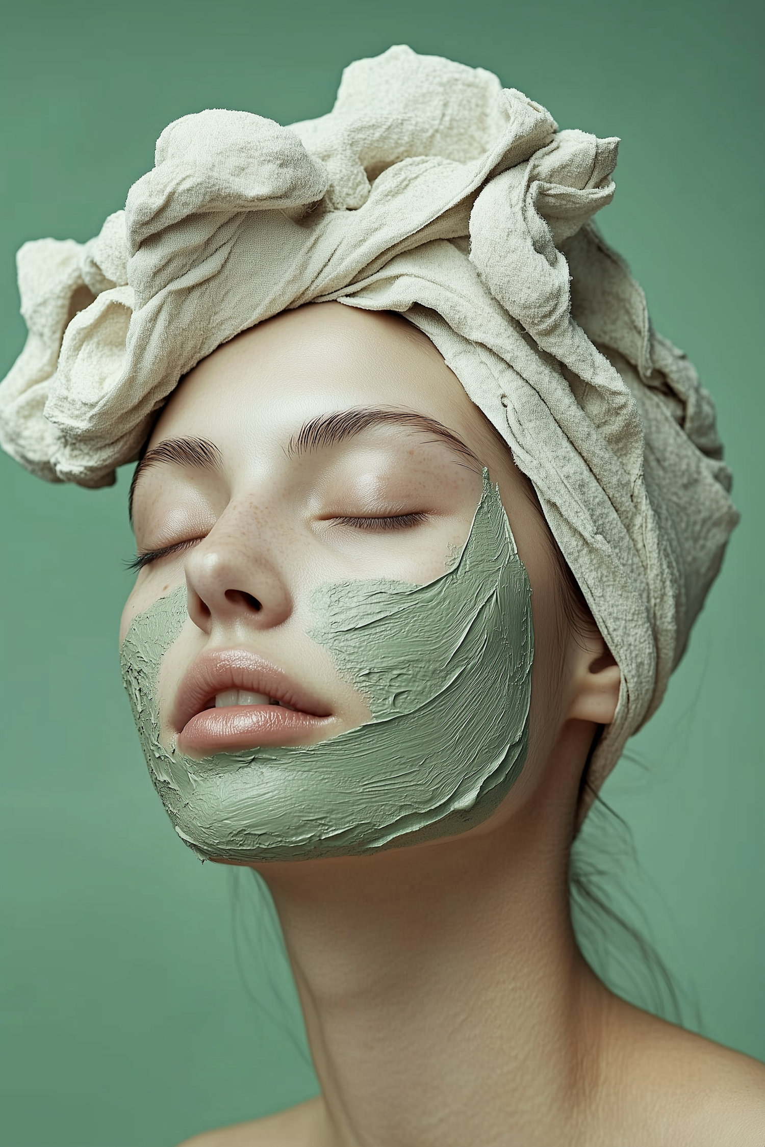 Serene woman with a green clay mask and towel wrap, embodying relaxation and skincare in a soothing green setting.