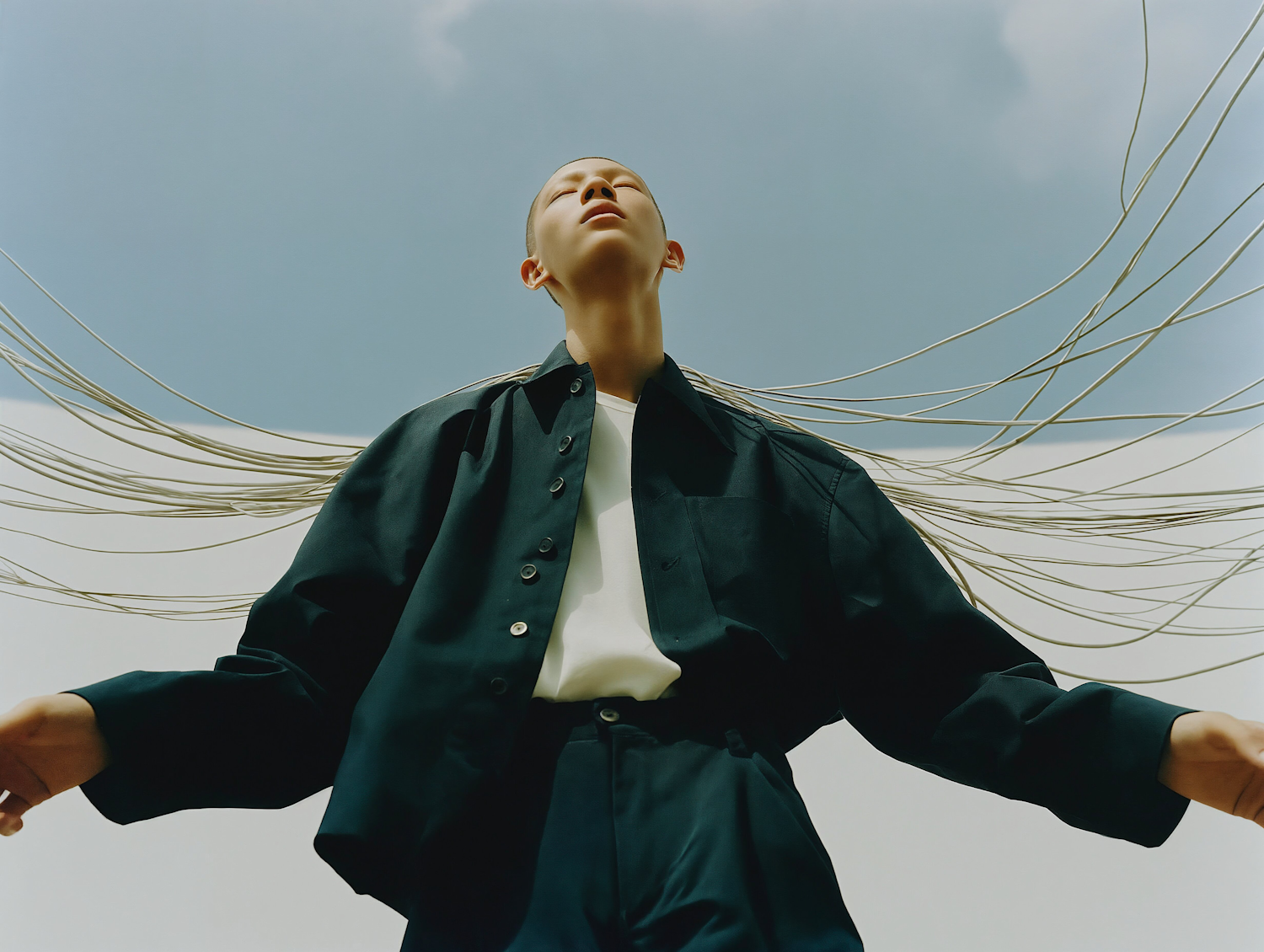 A striking low-angle shot of a person in dark attire with surreal wire-like extensions, set against a clear blue sky.
