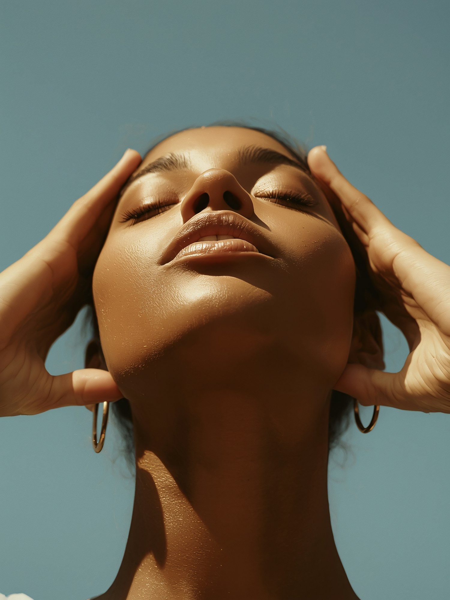 Close-up of a serene individual with glowing skin, gold hoop earrings, and a clear blue sky background, exuding calm and warmth.