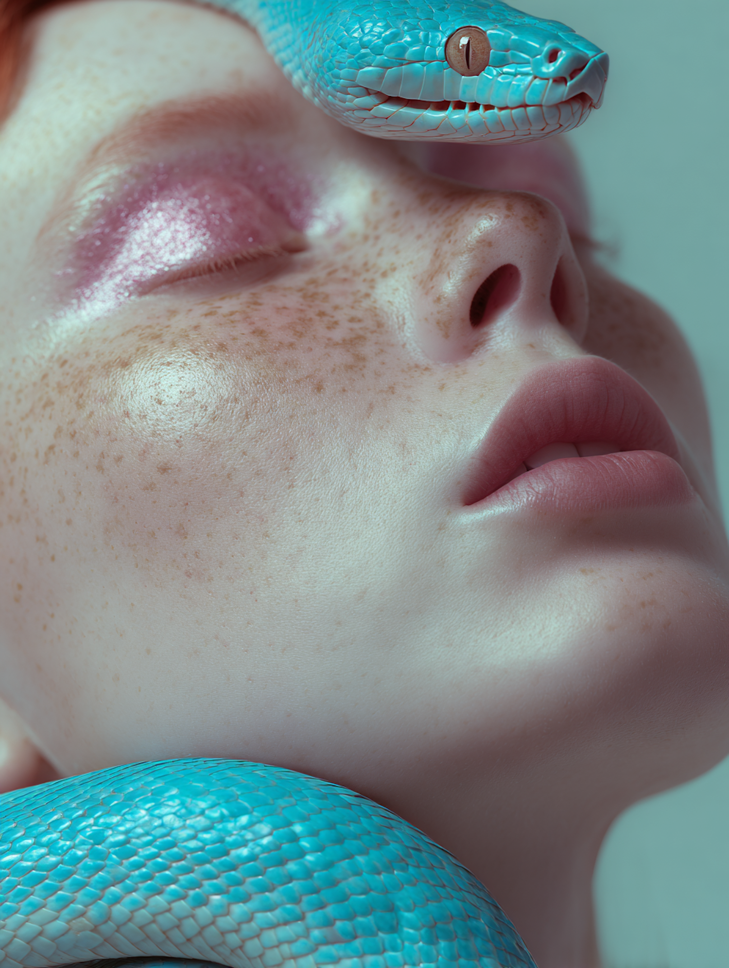 A close-up of a freckled face with shimmering pink eyeshadow and a vibrant turquoise snake, creating a striking artistic composition.