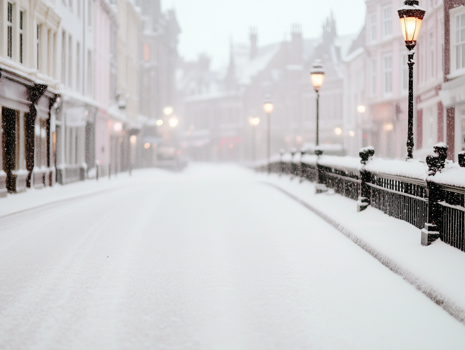Snow-covered street with glowing lamps and elegant buildings, creating a serene winter atmosphere.