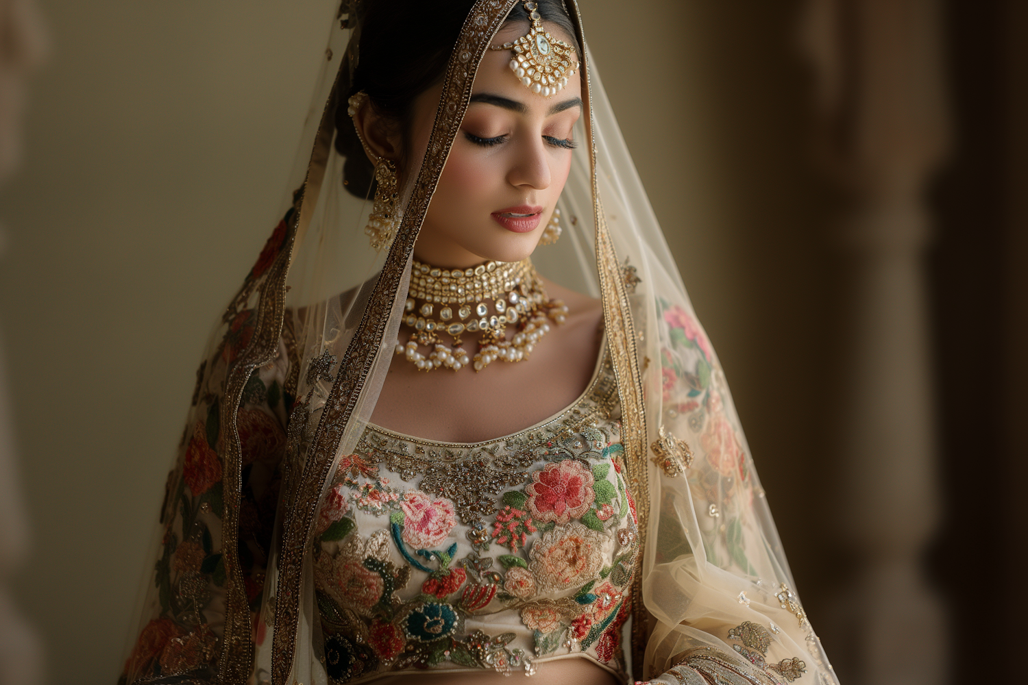 South Asian bride in ornate lehenga with floral embroidery, pearl jewelry, and a serene expression. Traditional elegance captured beautifully.