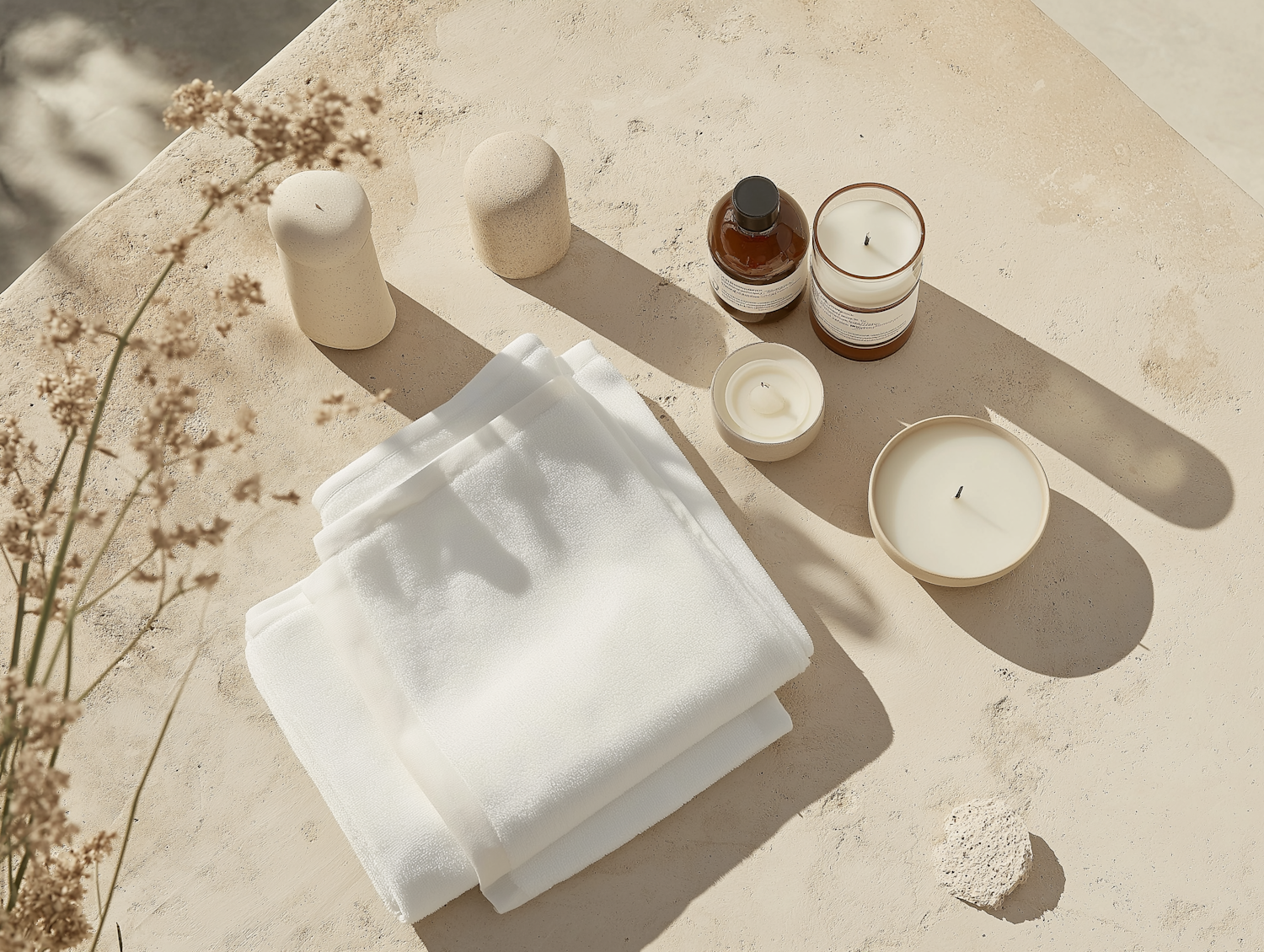 Minimalist spa setup with white towels, candles, and natural decor on a beige surface, perfect for a calming and serene vibe.