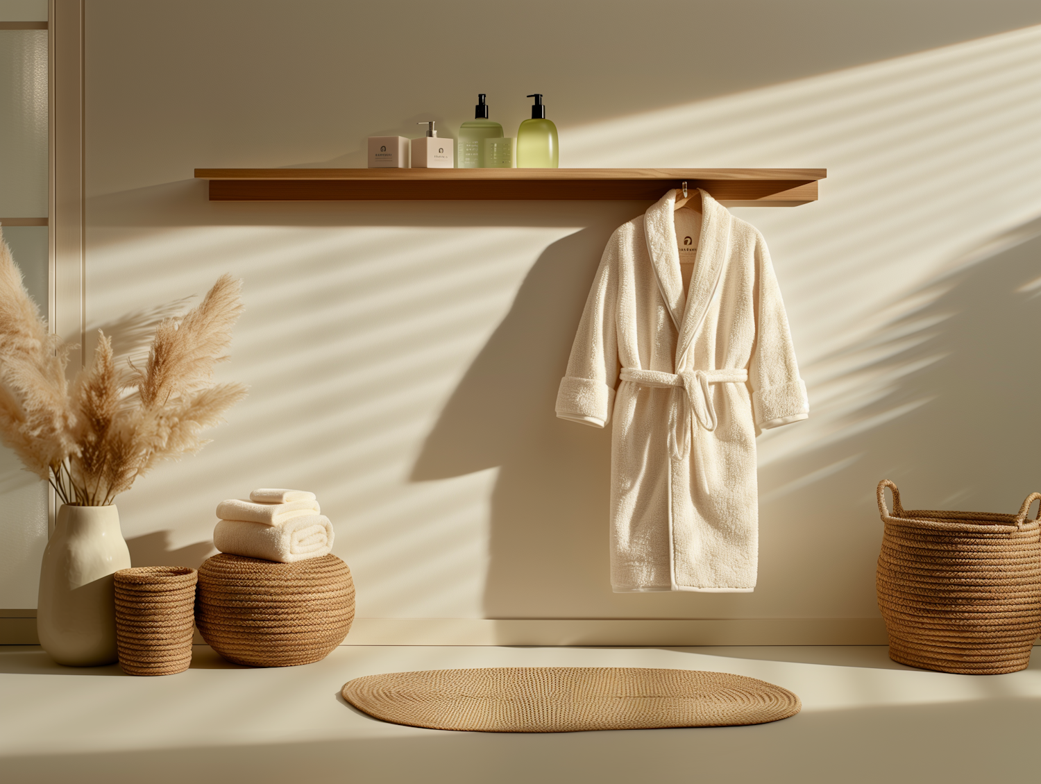Elegant bathroom with a white robe, woven baskets, pampas grass, and soft lighting creating a tranquil, spa-like atmosphere.