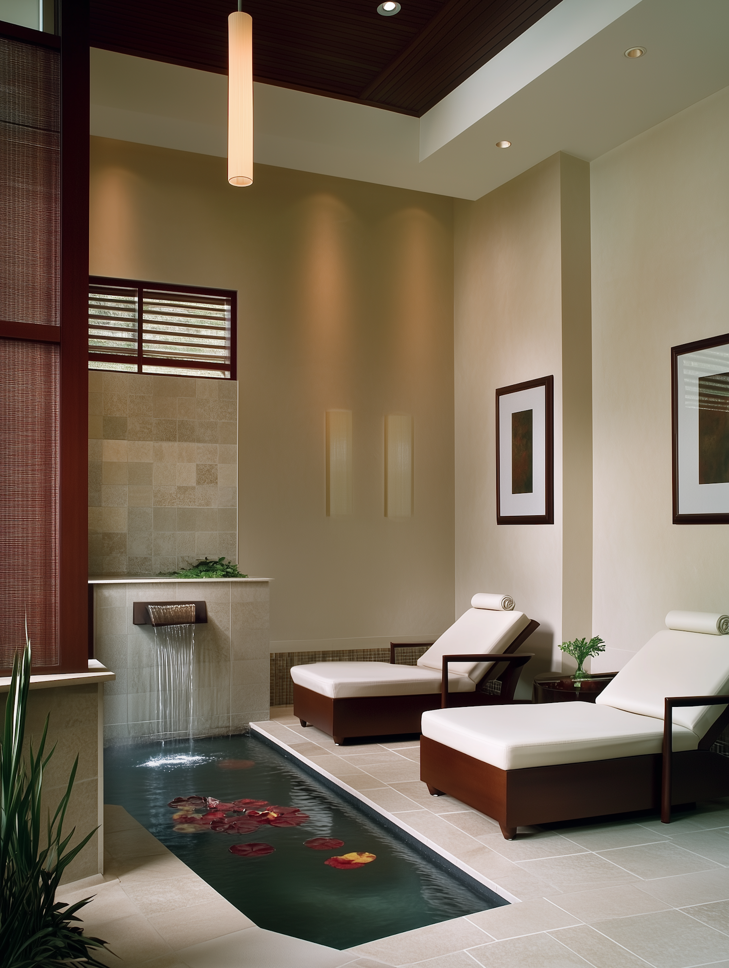 Relaxing spa room with lounge chairs, a water feature with floating petals, and soft beige tones for a tranquil atmosphere.