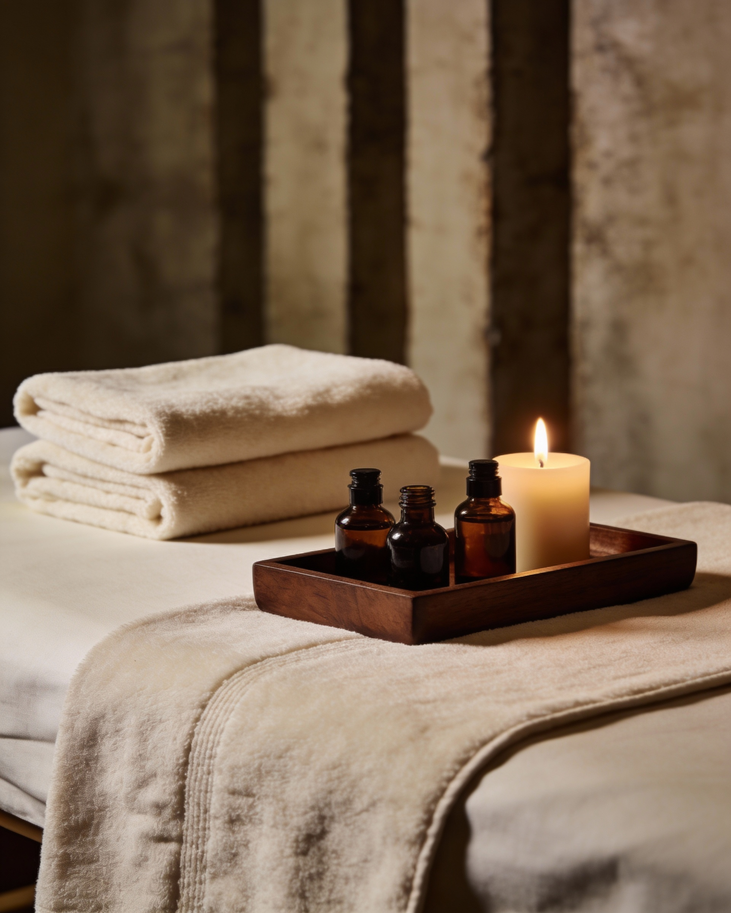 Warm spa photography, premium wellness atmosphere, soft diffused warm lighting, low contrast, gentle shadows, intimate and calming mood, minimalist composition, high-end editorial aesthetic, shallow depth of field, subtle film grain, realistic textures, cinematic look, massage table with folded creamy beige towels, small dark amber glass bottles, wooden tray in deep brown, candle with soft flame, background wall in rustic taupe vertical texture