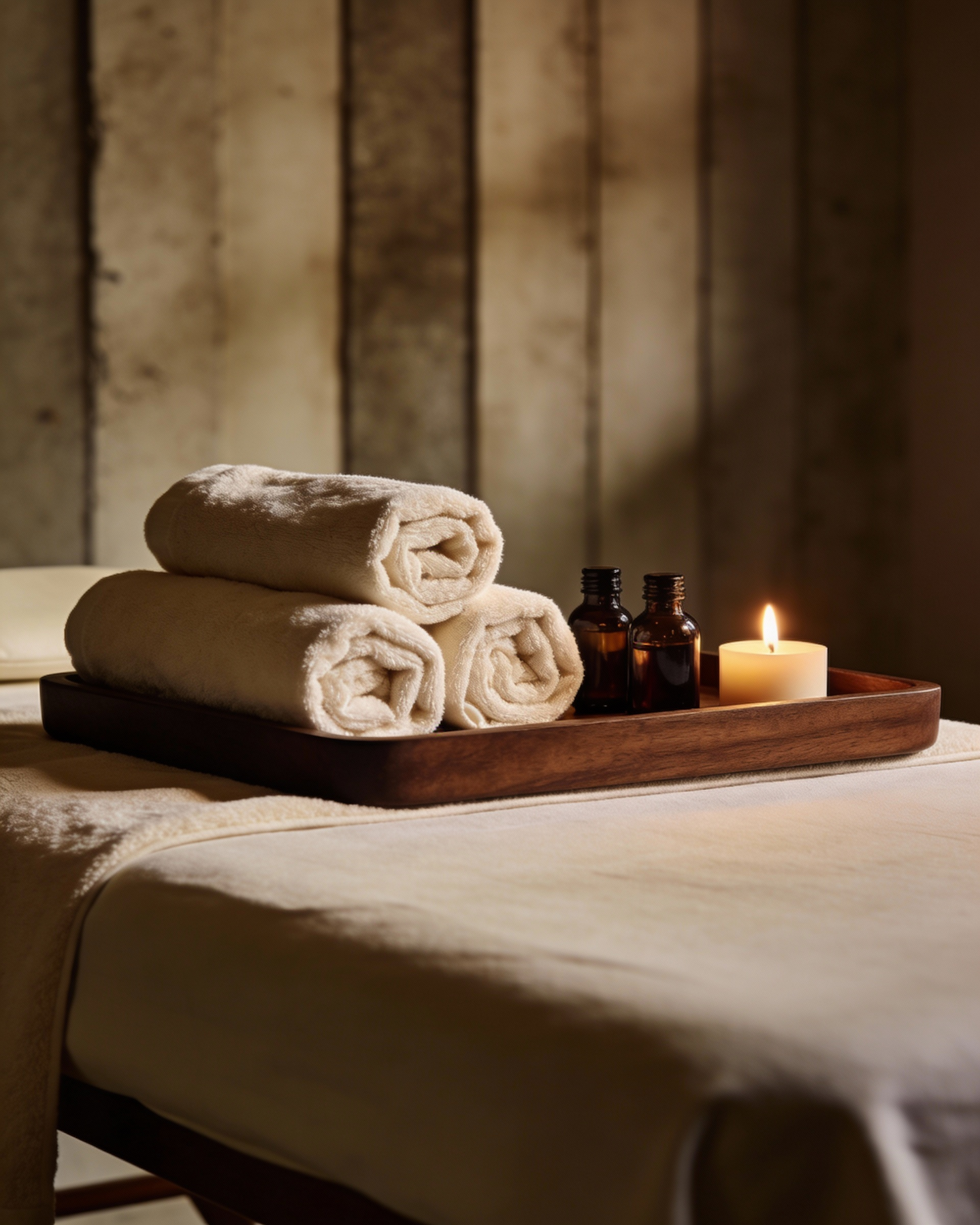 A cozy spa setup with rolled towels, essential oil bottles, and a lit candle on a wooden tray, perfect for relaxation.