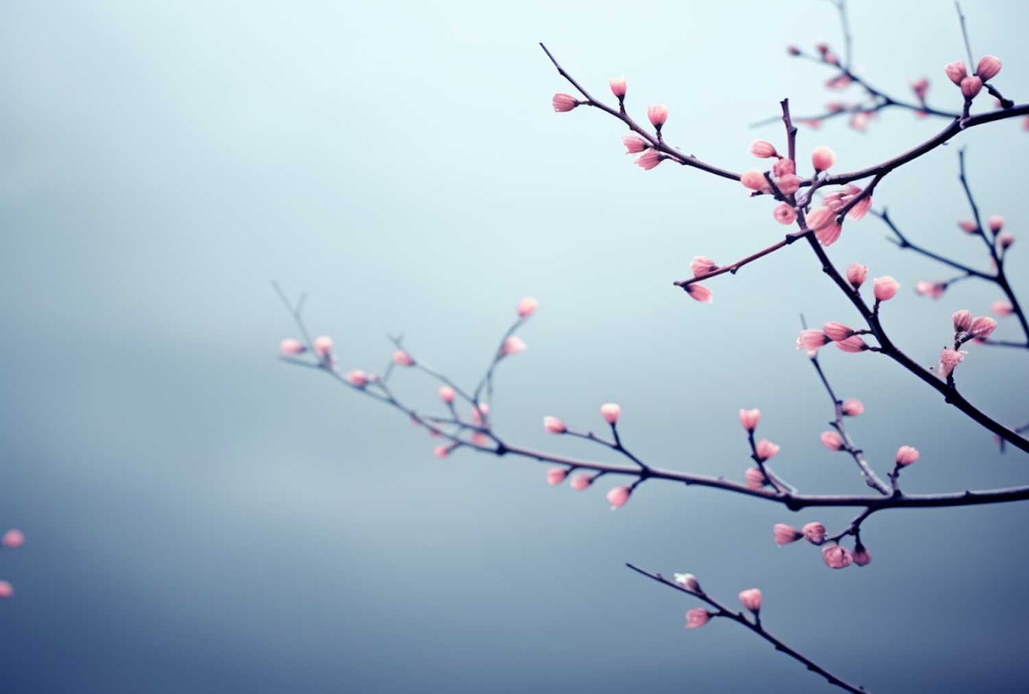 Serene branches with pink buds against a muted sky, capturing the essence of spring's promise and tranquility.
