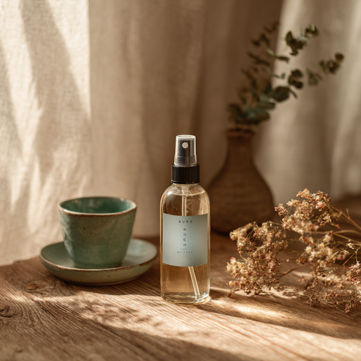 A spray bottle, green ceramic cup, and dried flowers on a wooden table, bathed in warm natural light for a cozy aesthetic.