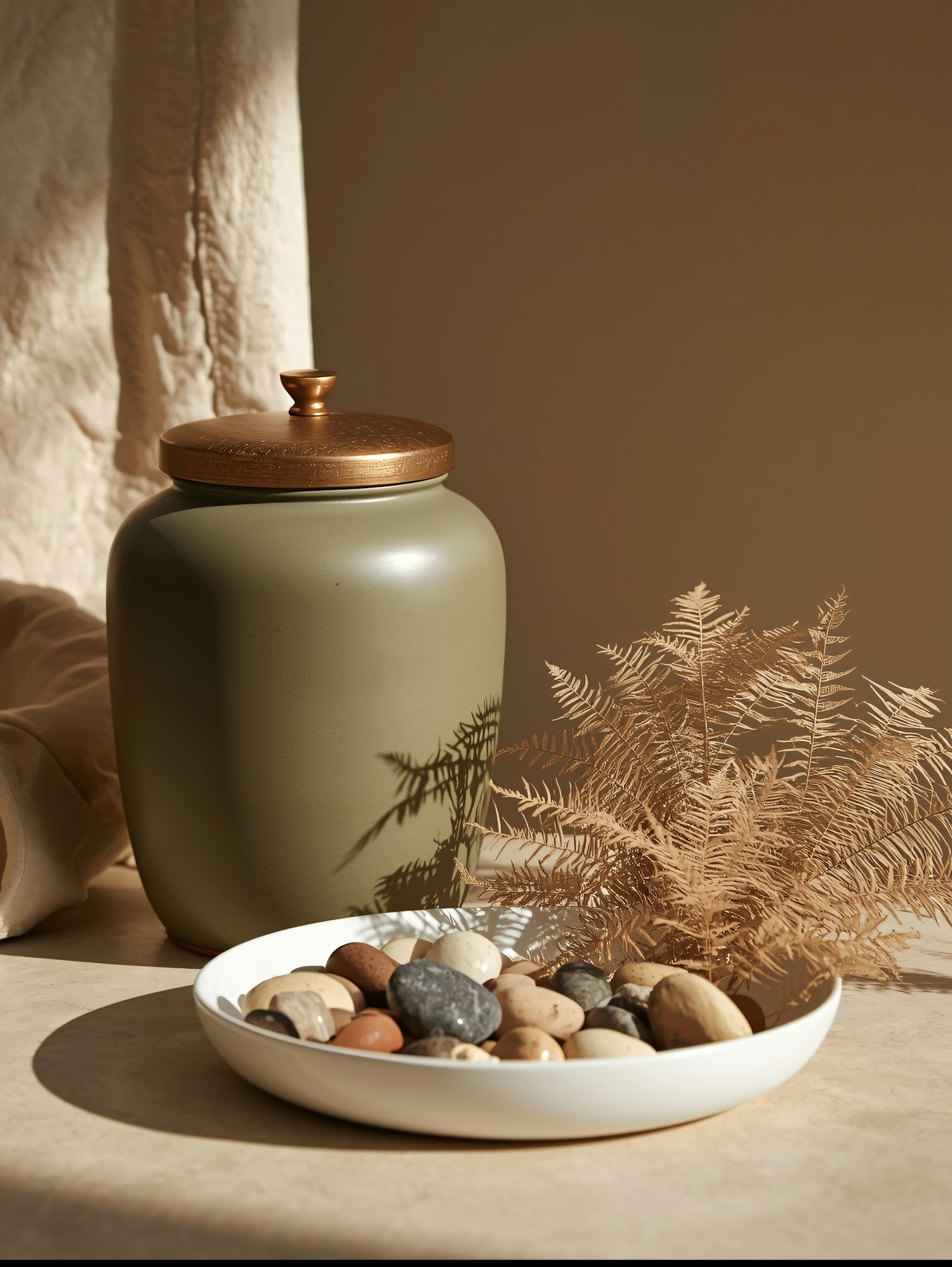 Elegant still life with a green jar, golden lid, pebbles in a white bowl, and a dried fern, bathed in warm, natural light.
