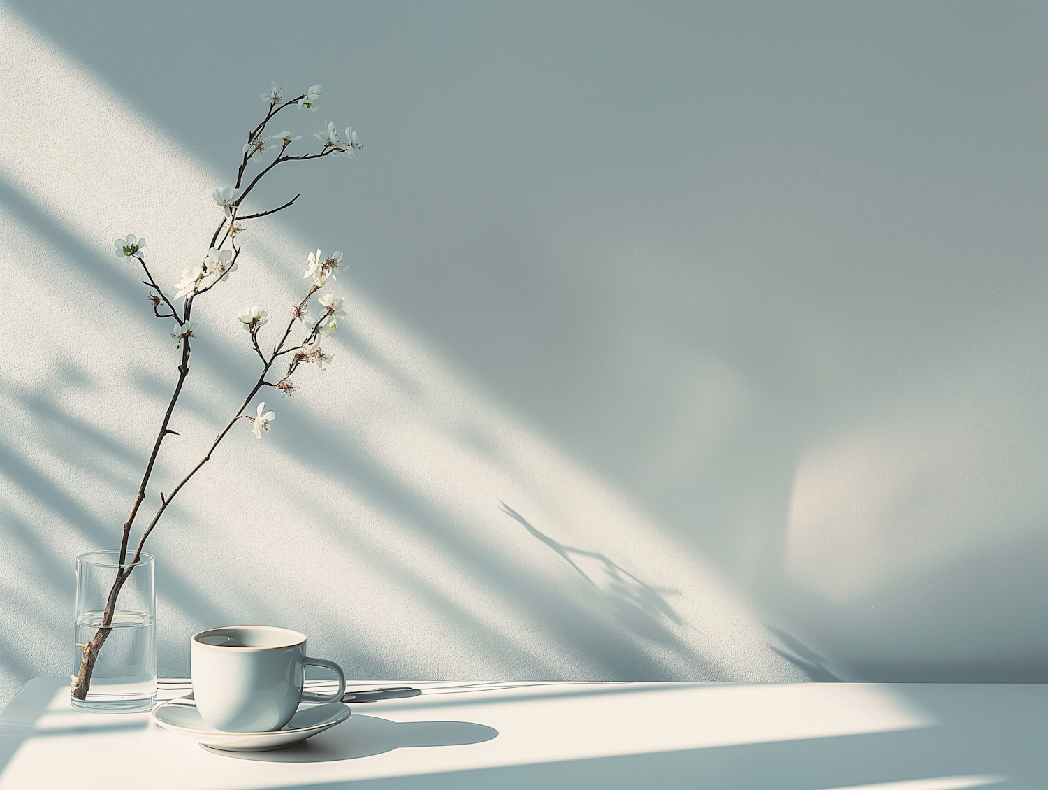 Minimalist scene with a white cup and blossoming branch in a glass vase against a soft blue background, creating a serene atmosphere.