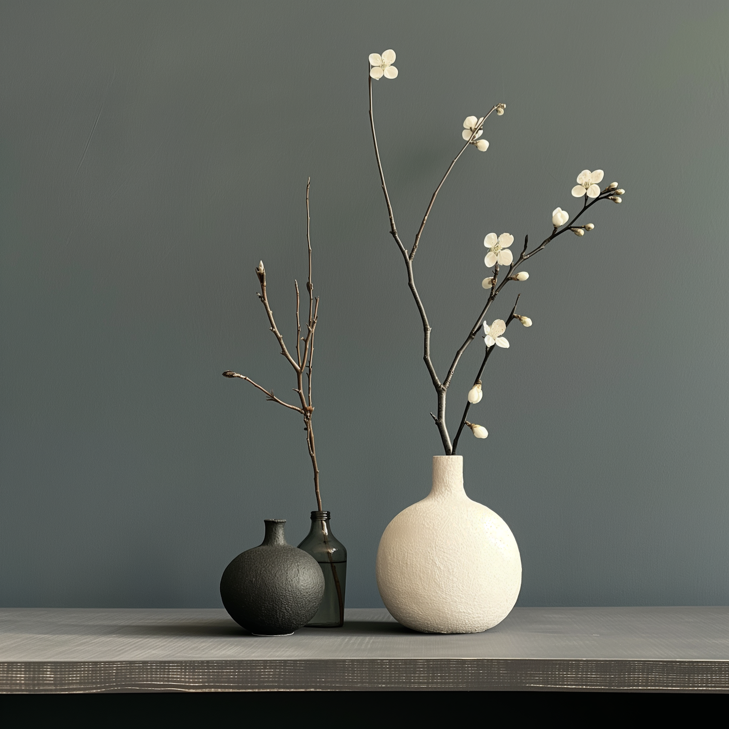 Minimalist still life with textured vases and branches on a wooden surface against a muted green background.