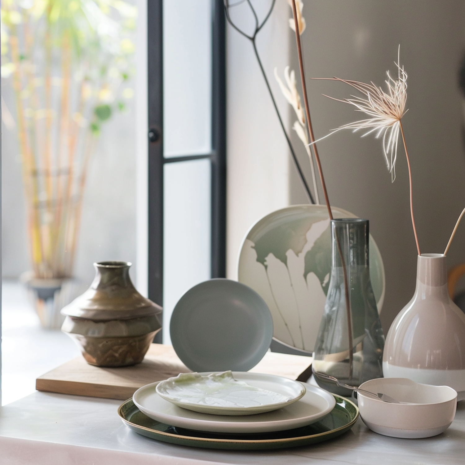 Elegant tabletop with ceramic and glassware, featuring muted tones and natural light for a minimalist aesthetic.