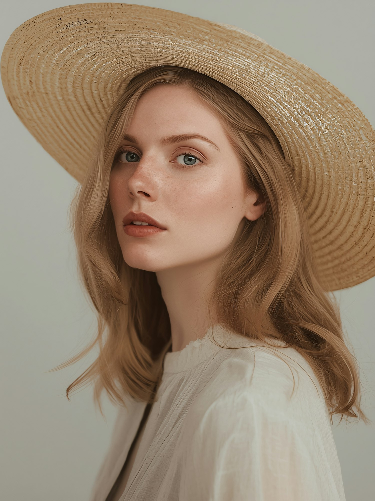 A serene portrait of a woman in a straw hat and light blouse, with soft lighting and a neutral background enhancing her natural beauty.