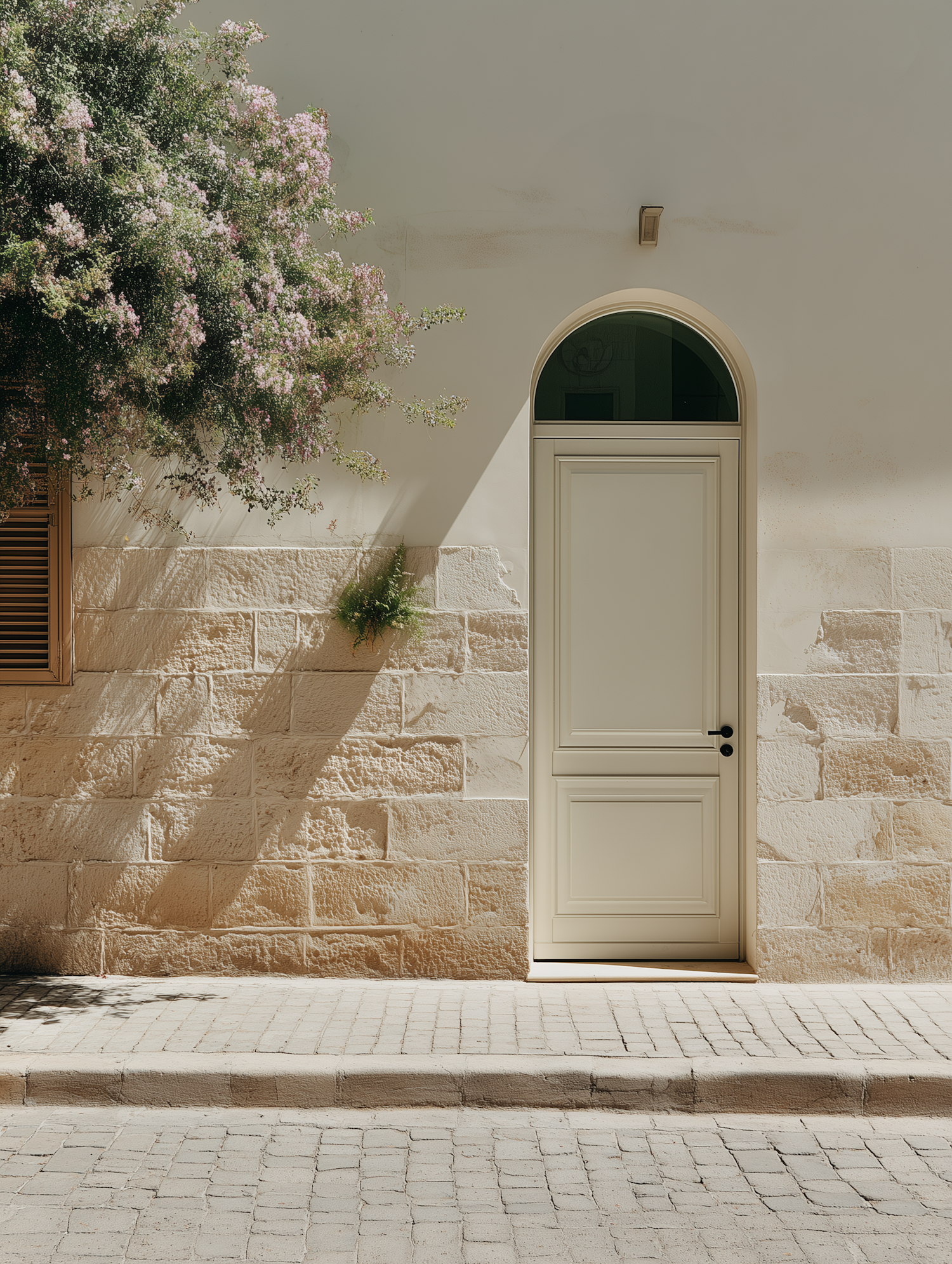 A charming arched door on a stone wall, shaded by a flowering tree, with cobblestone pavement in a tranquil setting.