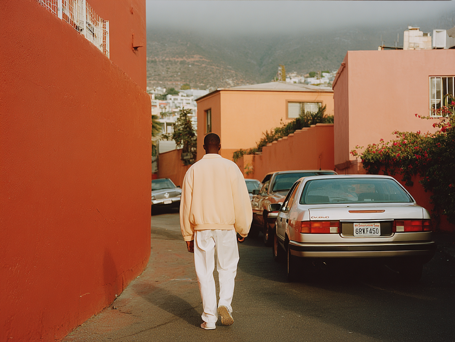 A person walks down a colorful street with orange and pink buildings, parked cars, and a misty hill in the background.