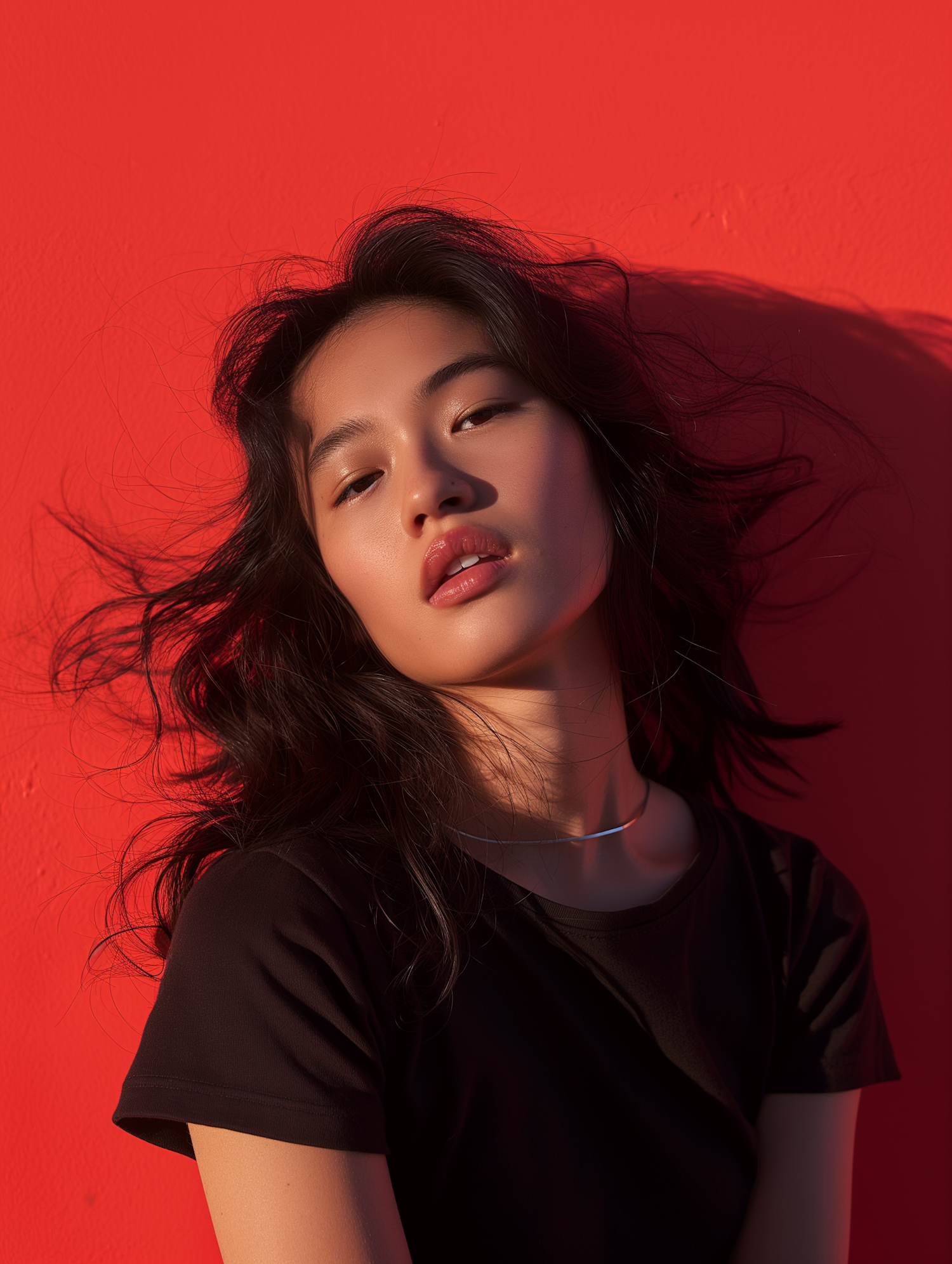 Asian woman with wavy black hair against a vibrant red background, wearing a black t-shirt and silver necklace.