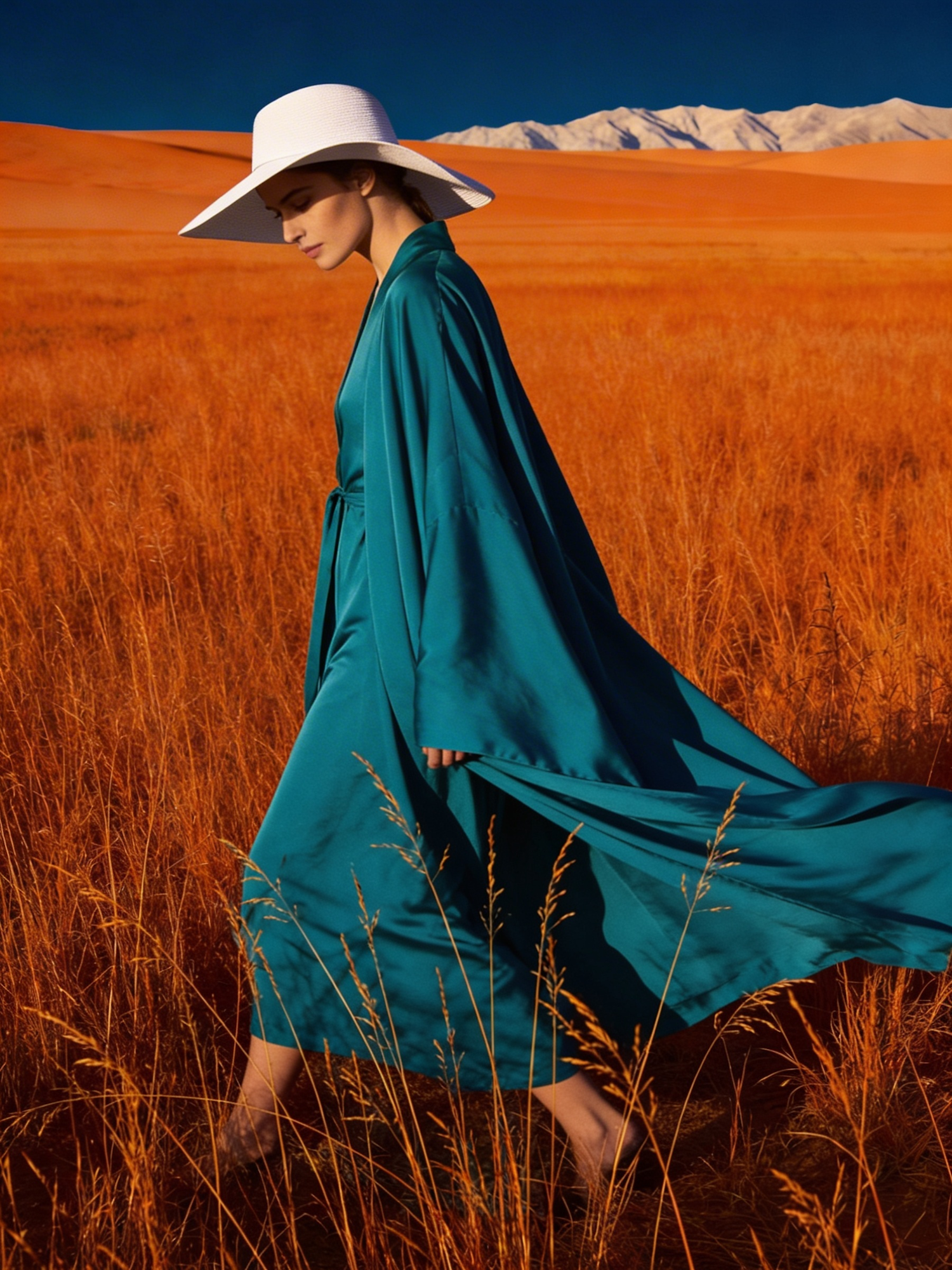 A woman in a teal robe and white hat walks through an orange field with dunes and mountains in the background, under a vivid blue sky.
