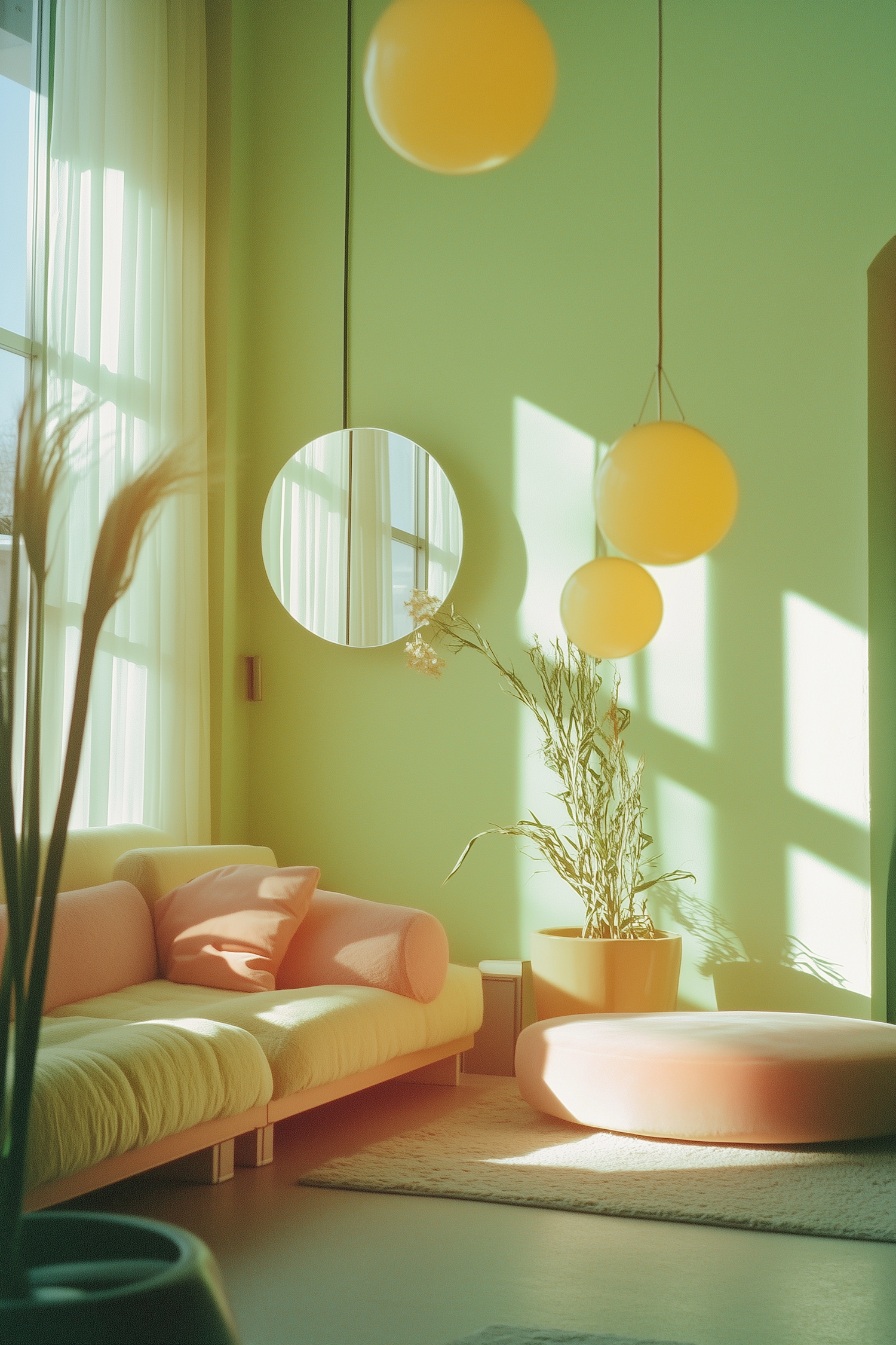 Serene living room with pastel green walls, pink sofa, and spherical pendant lights. Natural light enhances the tranquil ambiance.