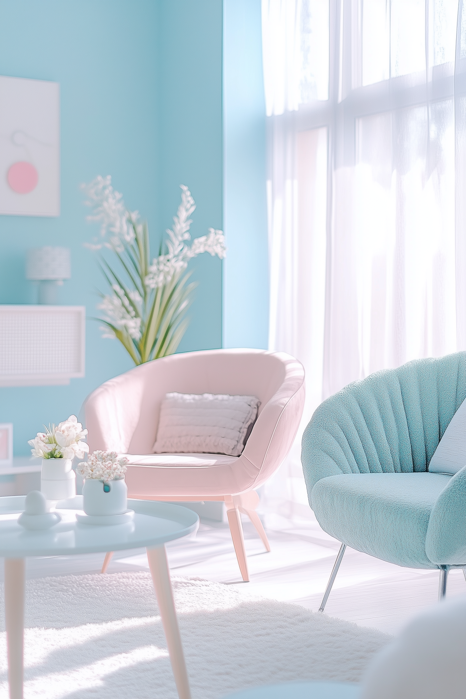 Bright living room with pastel pink and mint green chairs, white coffee table, and large windows. Soft, airy, and stylish decor.