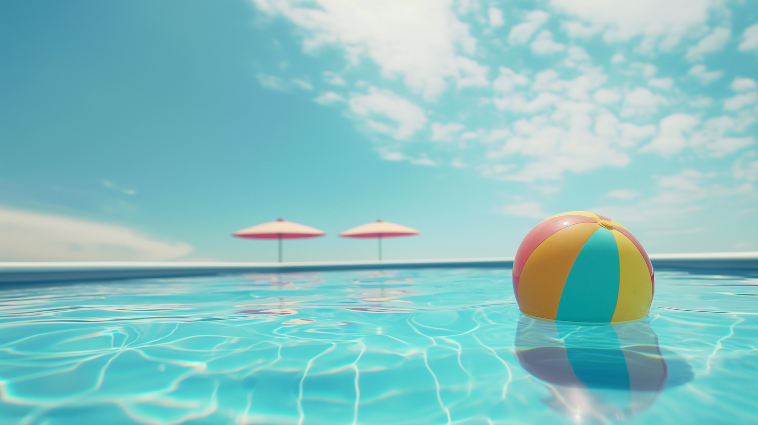 Colorful beach ball floating in a clear blue pool with umbrellas and a sunny sky, capturing a perfect summer day vibe.