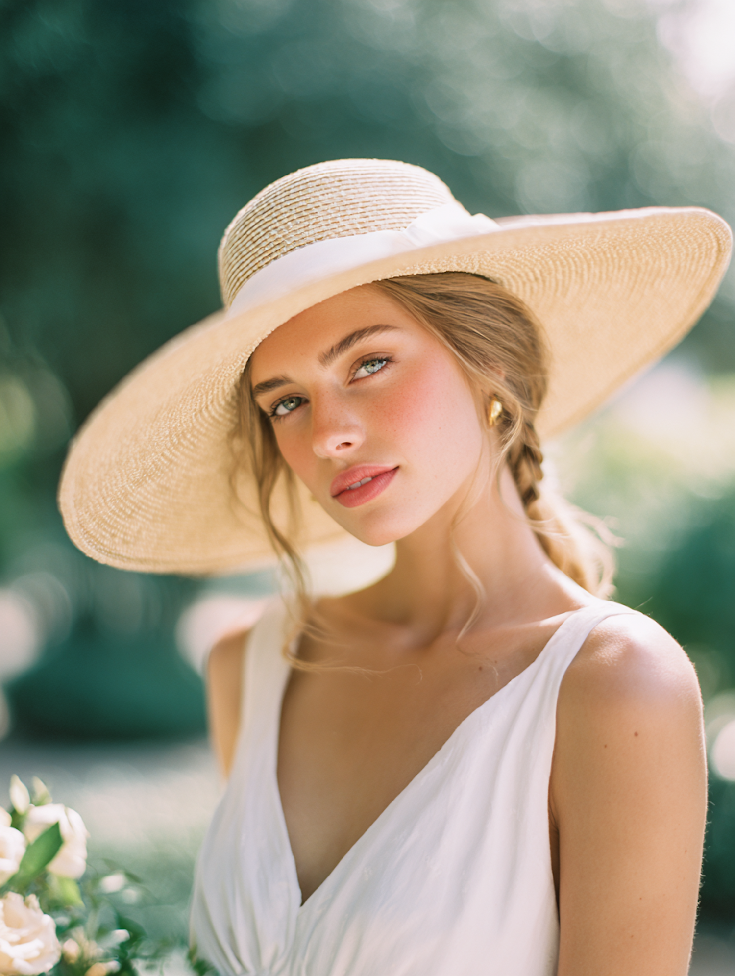 A serene portrait of a woman in a white dress and straw hat, set against a soft, natural green background.