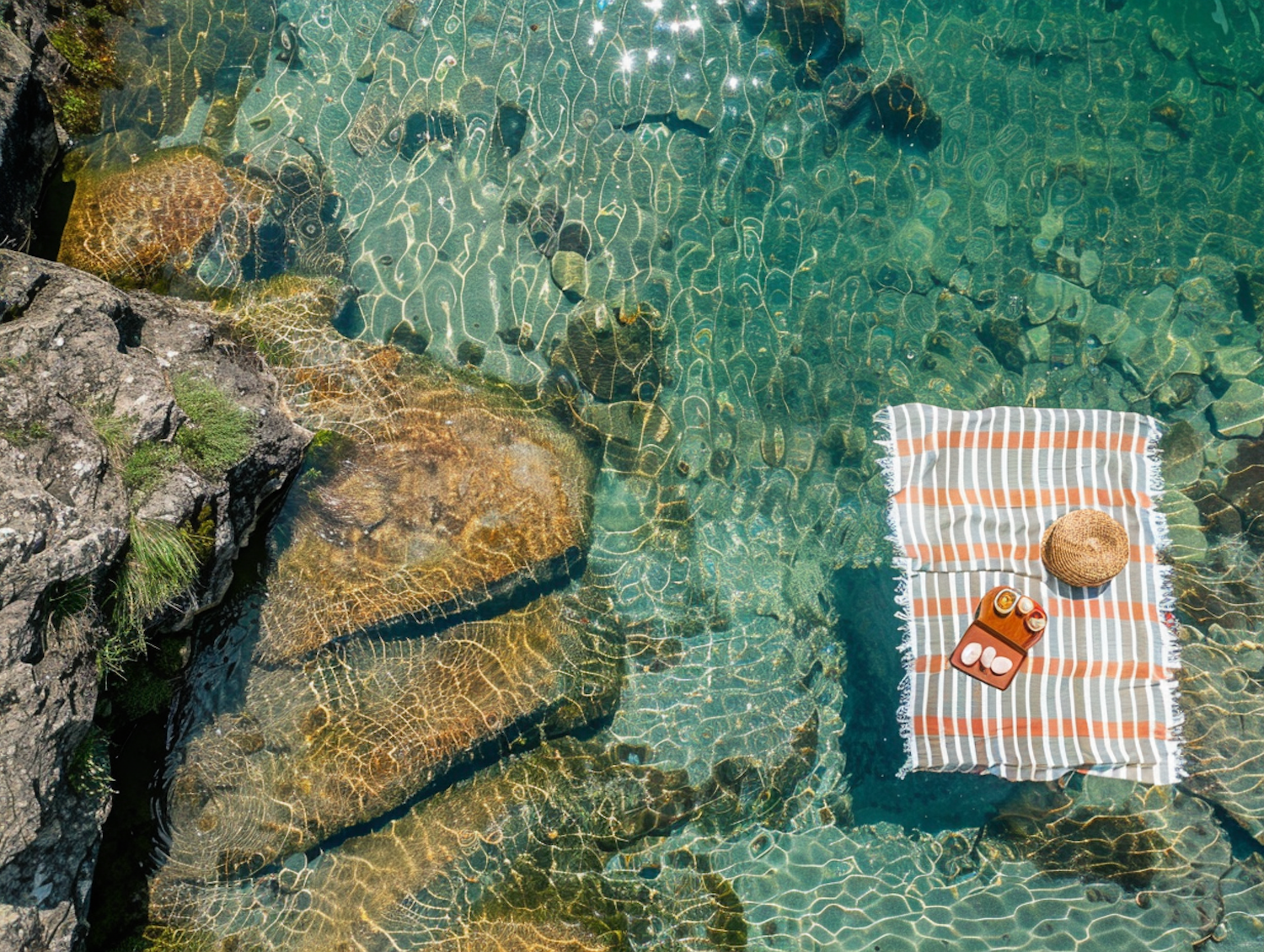 Floating picnic setup on clear turquoise water with rocks and sunlight reflections, featuring a striped blanket, straw hat, and snacks.