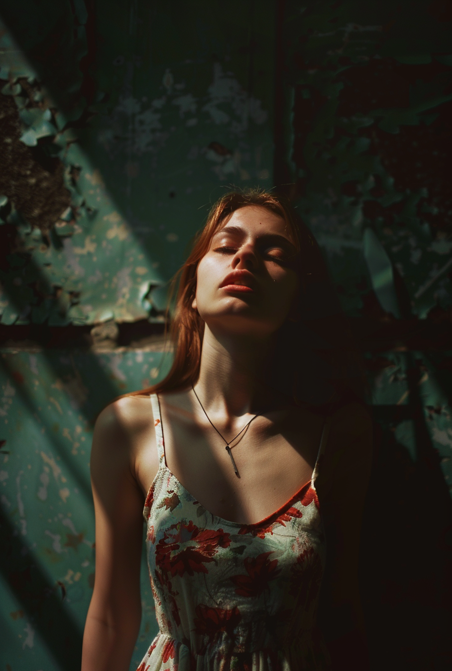 Young woman in floral dress basks in sunlight against a textured green wall, creating a serene and artistic atmosphere.