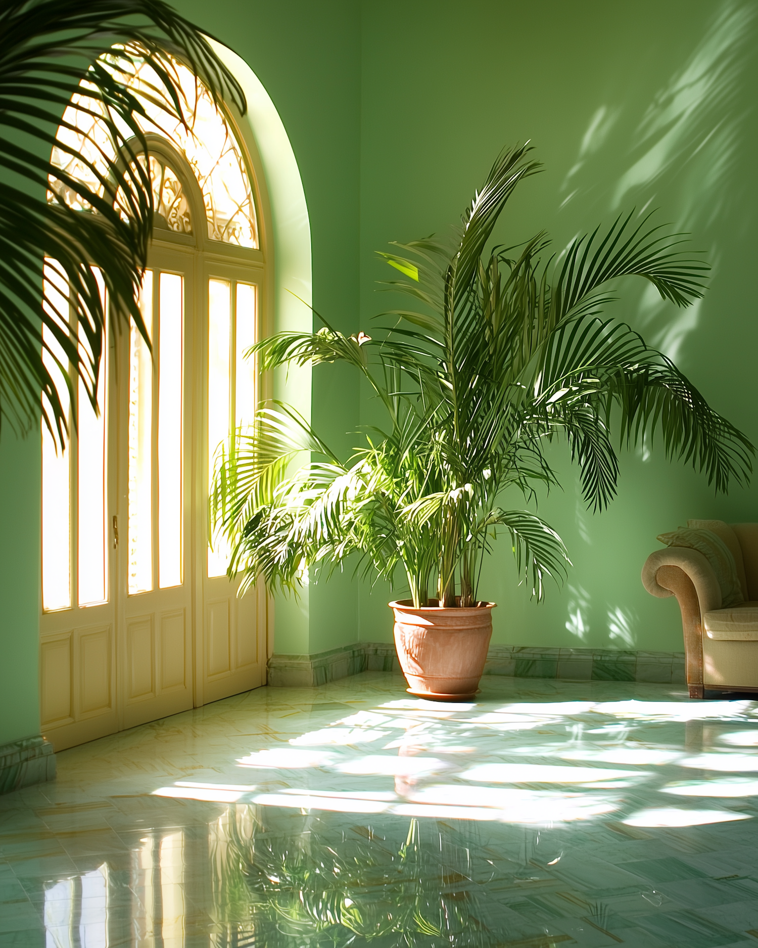 Bright, sunlit room with green walls, potted palm plants, and polished marble floors. A cozy beige armchair adds a touch of comfort.