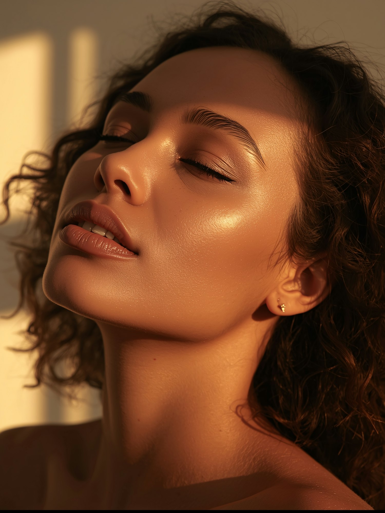 Close-up of a serene woman with glowing skin, basking in warm sunlight, her curly hair framing her face beautifully.