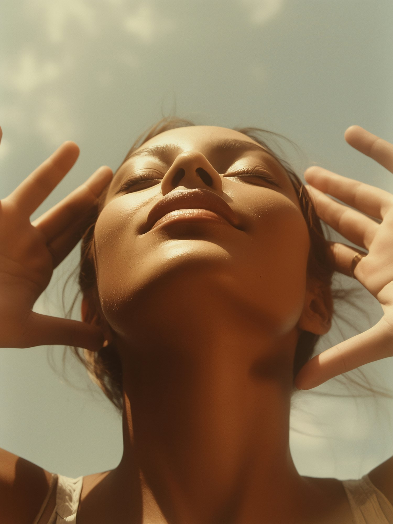 A serene close-up of a person enjoying sunlight, with a clear sky background and warm lighting emphasizing their features.