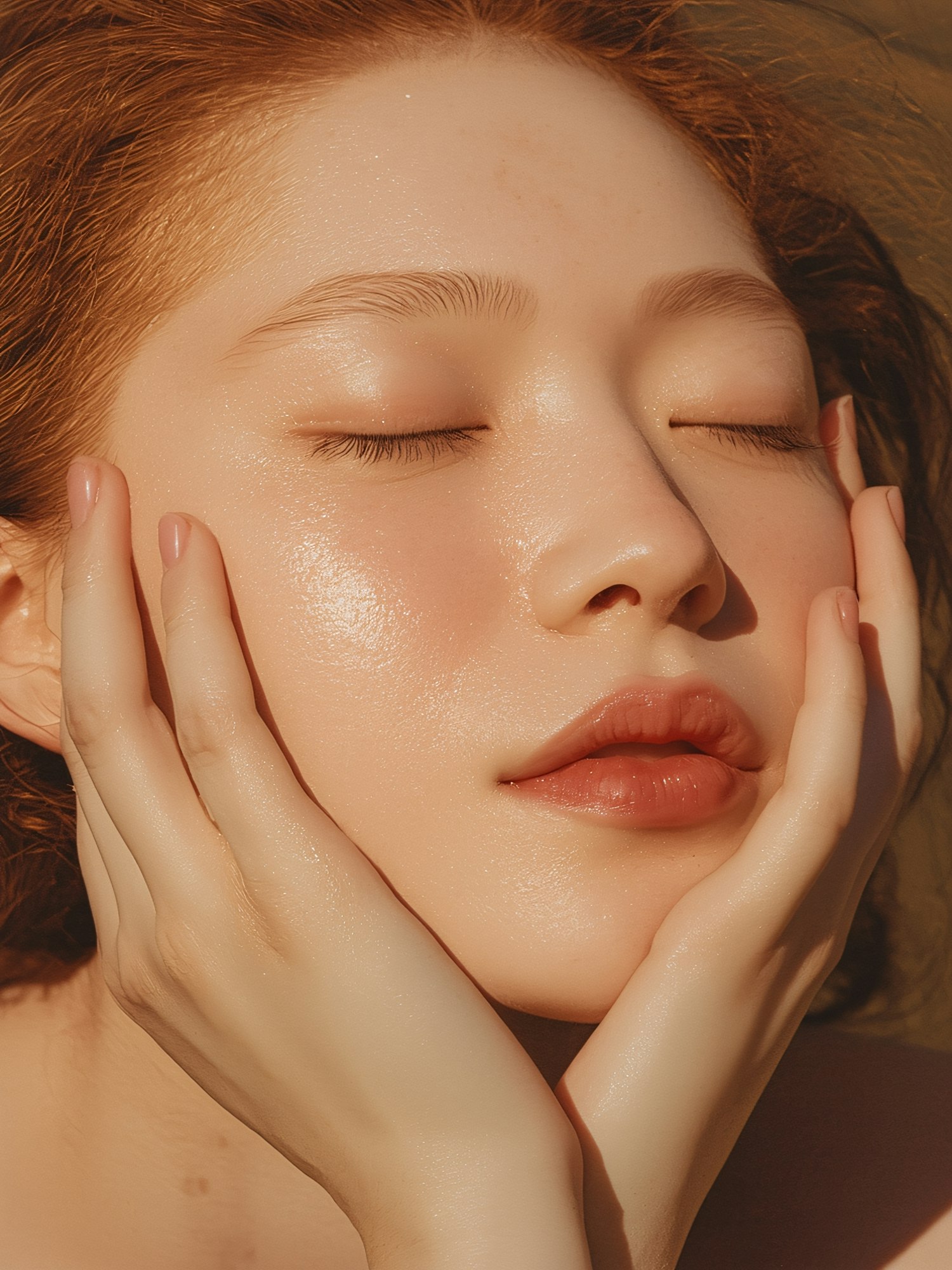 Close-up of a serene face with glowing skin, red hair, and closed eyes, gently cradled by hands in warm sunlight.