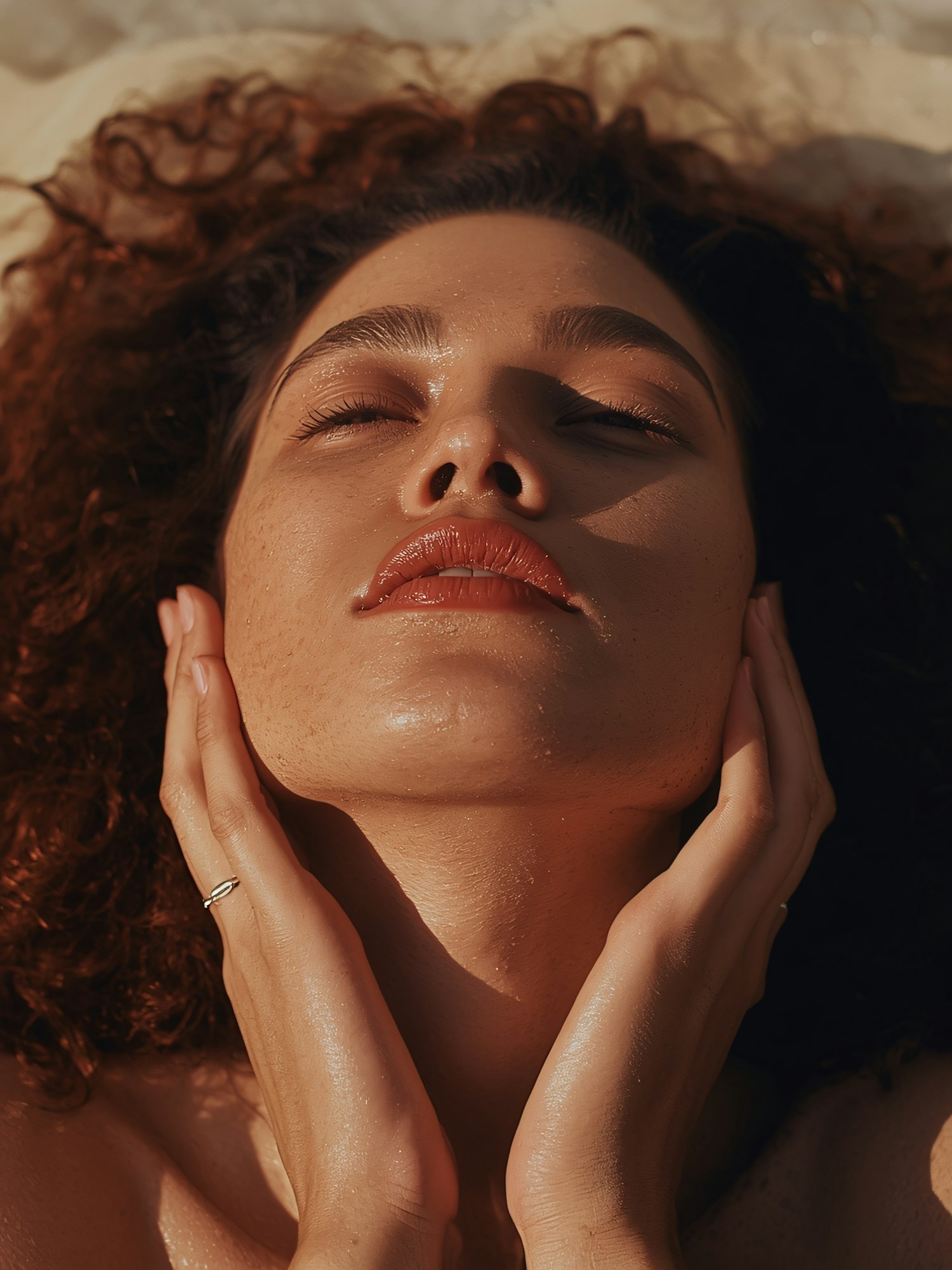 Close-up of a serene individual with closed eyes, glowing skin, and curly hair, basking in sunlight with hands gently cradling their face.