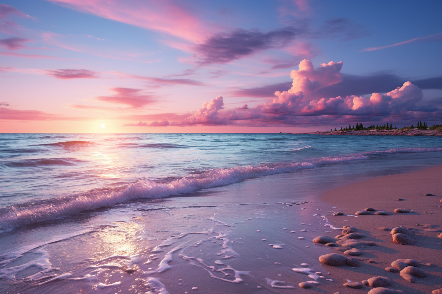 Stunning sunset over a tranquil beach with colorful sky, gentle waves, and smooth stones on the shore. Perfect for nature lovers.