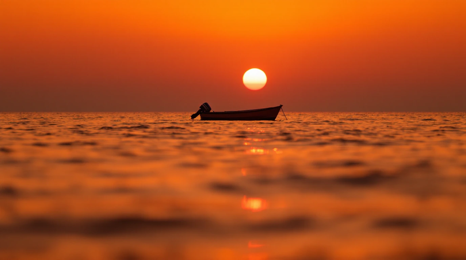 Serene sunset over a calm sea with a silhouetted boat, vibrant orange hues reflecting on the water.
