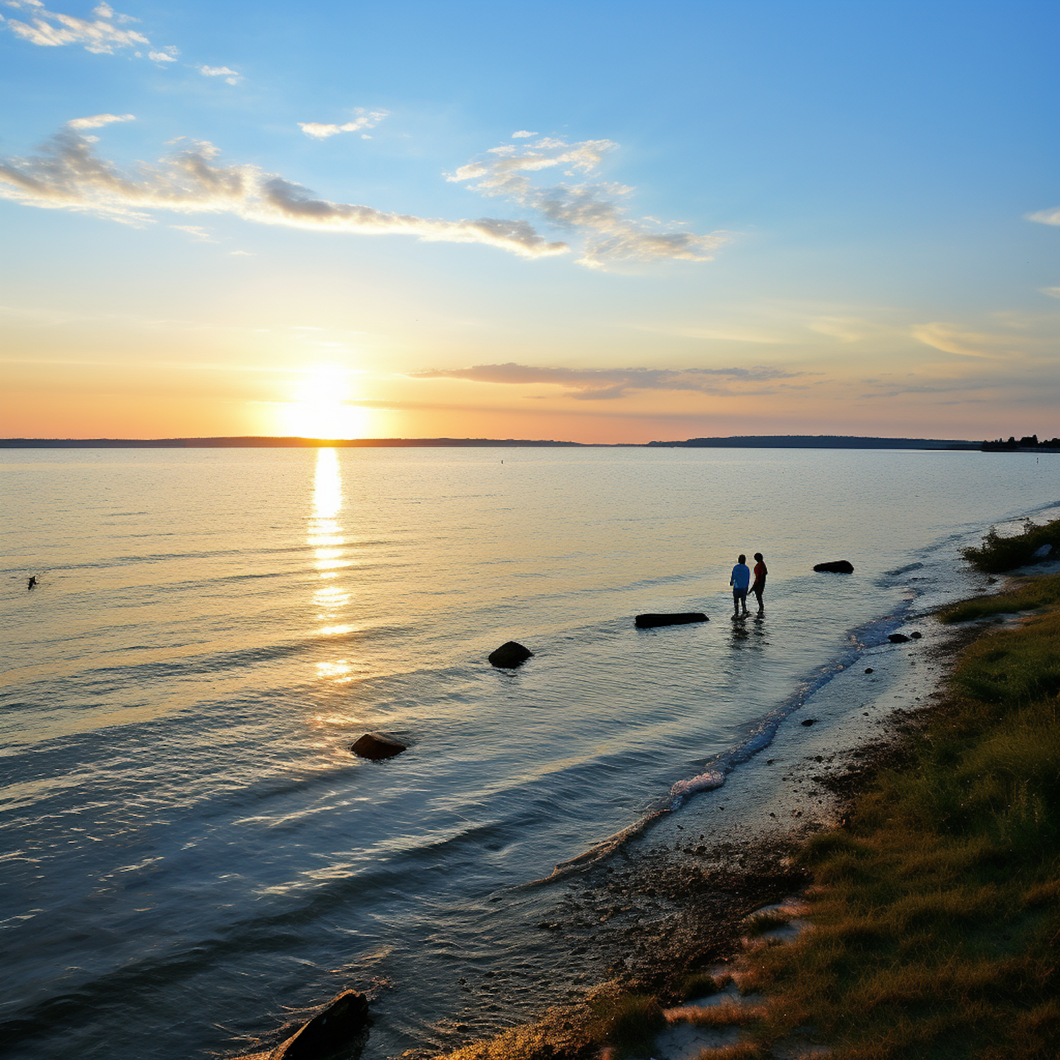 Serene sunset beach scene with two silhouetted figures by the water, reflecting golden hues and a tranquil atmosphere.