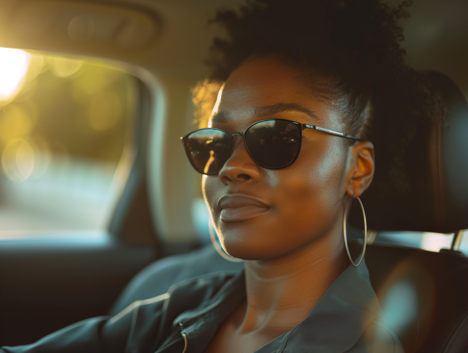 Confident woman with sunglasses and hoop earrings in a car, glowing in golden sunlight with a serene, stylish vibe.