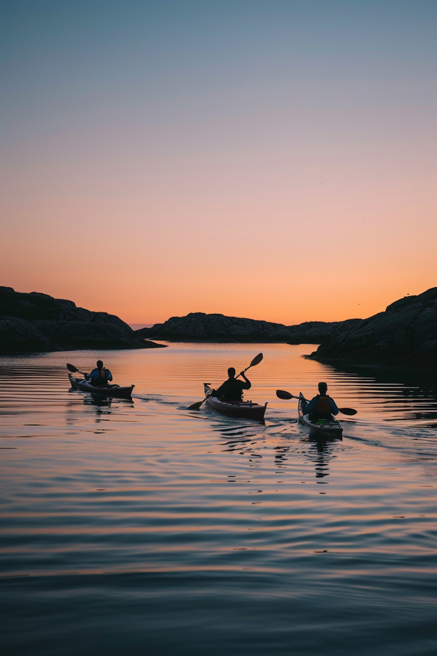 Three kayakers paddle through calm waters at sunset, silhouetted against a vibrant sky. A tranquil and adventurous scene unfolds.