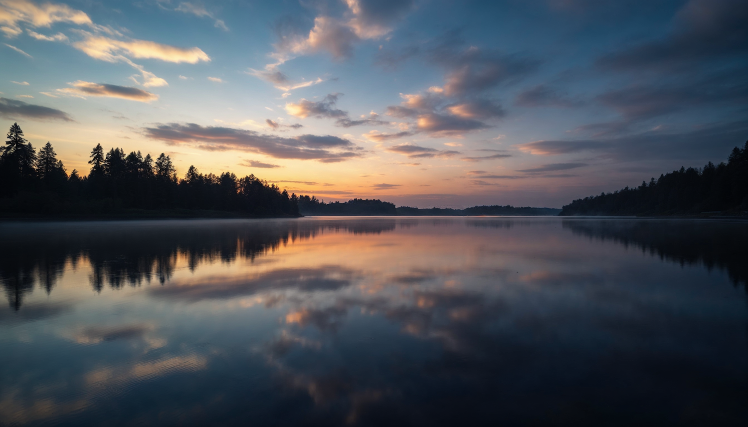 Tranquil lake at sunset with colorful sky reflections and silhouetted trees, creating a serene and peaceful atmosphere.